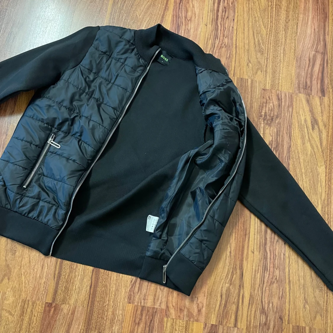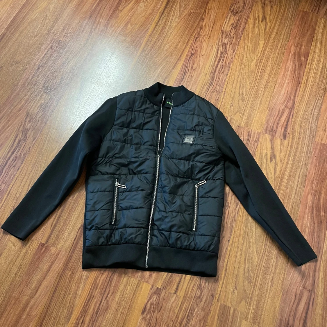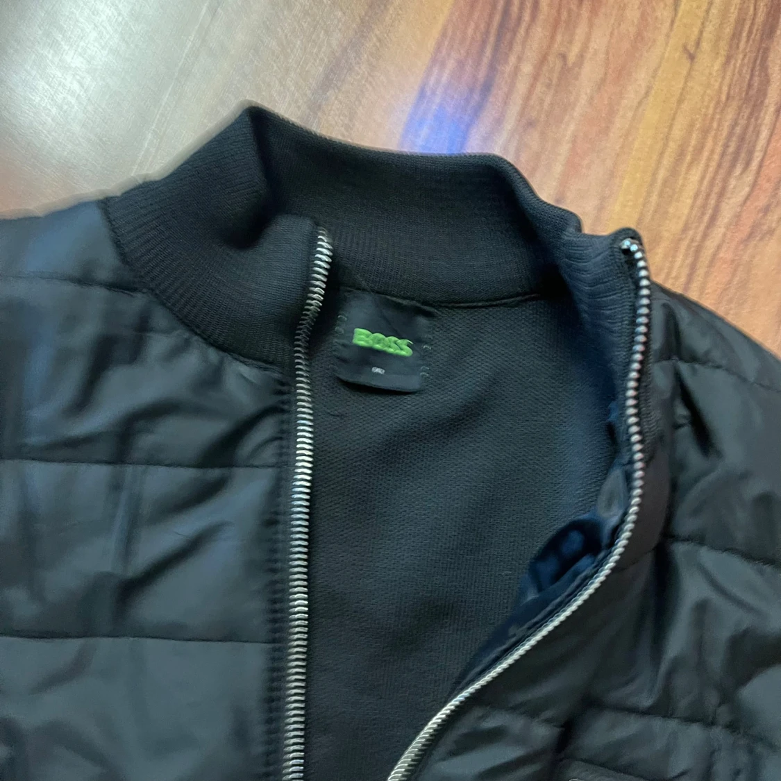 Svart bomberjacka från BOSS med quiltad framsida och släta ärmar och rygg. Jackan har två fickor med dragkedja, ribbad krage och nederkant. Materialmix med polyester och stickad textil ger en clean och modern look. Perfekt för dig som gillar stilrena detaljer.