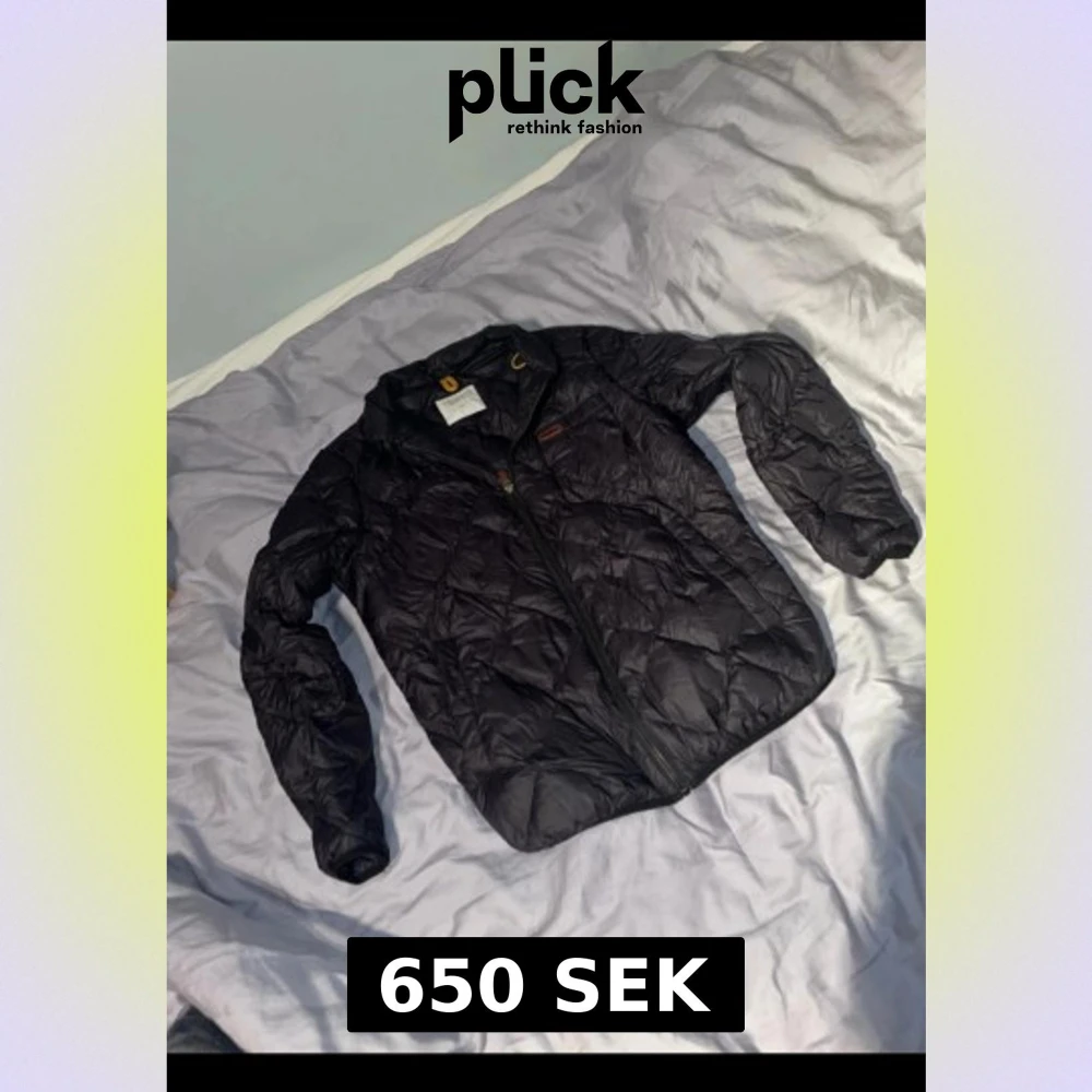 Svart dunjacka från Peak Performance i storlek M. Jackan har quiltad design, dragkedja framtill och en liten bronsfärgad detalj på bröstet. Materialet är glansigt och lätt, perfekt för kyliga dagar. Klassisk krage och långärmad modell.