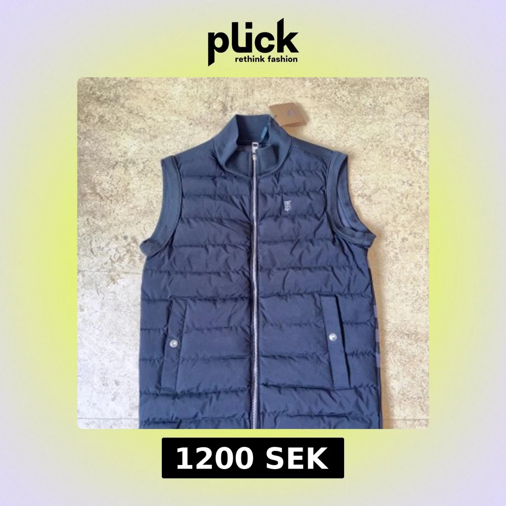 Snygg svart dunväst från Burberry med quiltad framsida, dragkedja och två fickor med knapp. Baksidan har klassiskt rutig Burberry-mönster i blå och grå toner. Perfekt för lager-på-lager och har en stilren ståkrage.