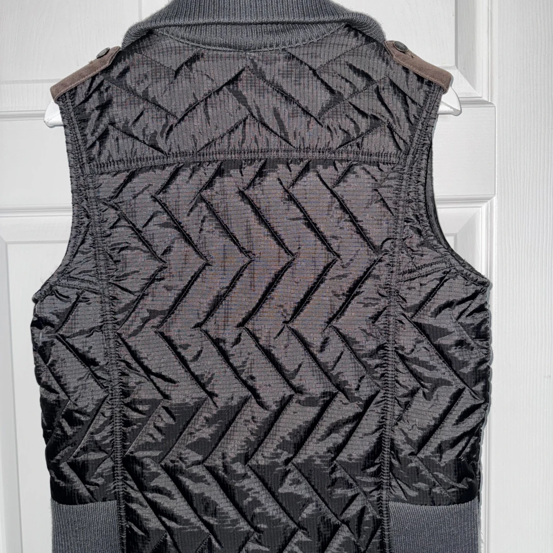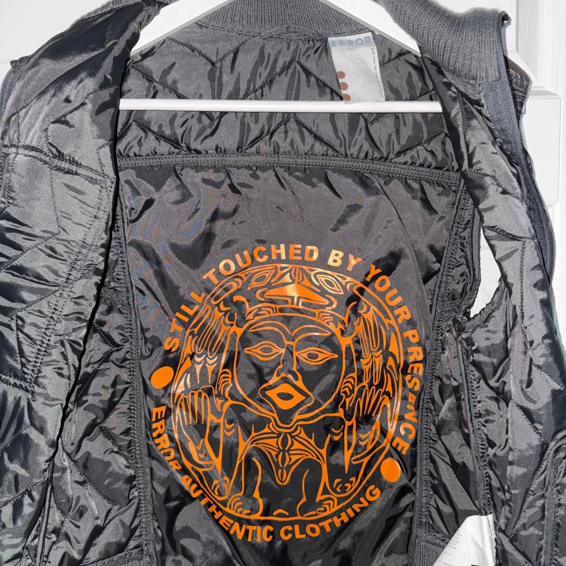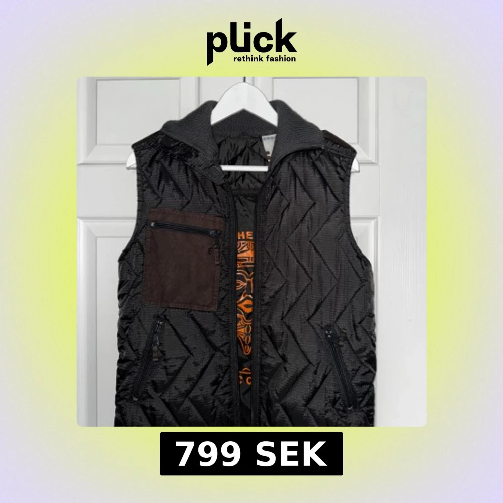 Svart quiltad dunväst från Error med grå ribbad krage och brunt bröstficka med dragkedja. Snyggt mönstrad insida med orange tryck och flera dragkedjefickor framtill. Perfekt för lager-på-lager och stilren look!