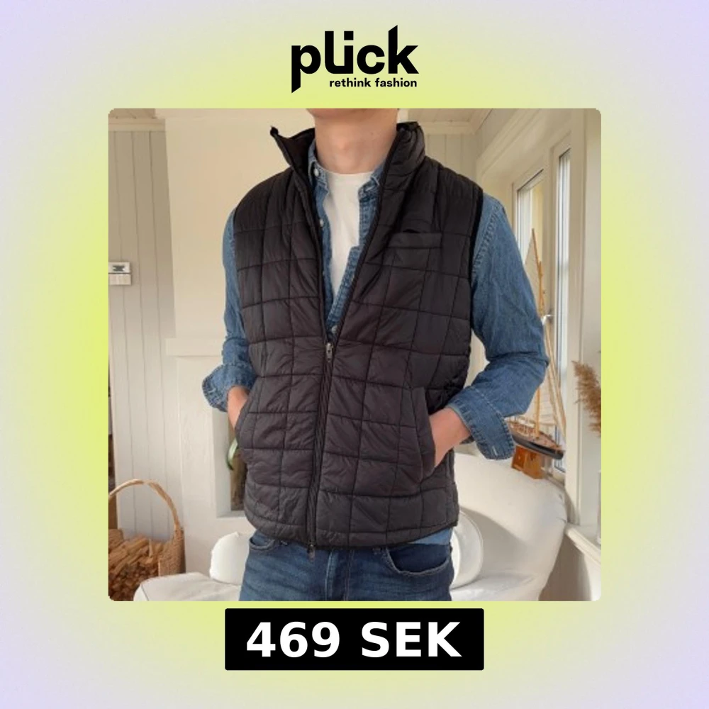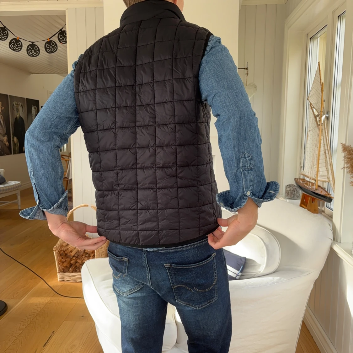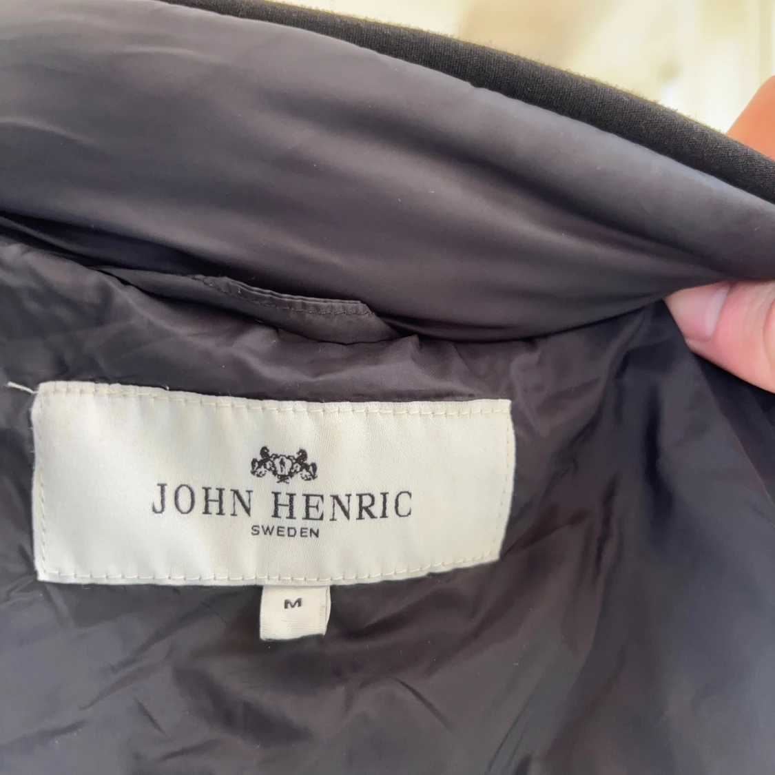 Svart dunväst från John Henric i storlek M. Västen har ett quiltat rutmönster, hög krage och dragkedja framtill. Perfekt att slänga över en hoodie eller skjorta för extra värme. Snygg och enkel design som funkar till jeans eller chinos.