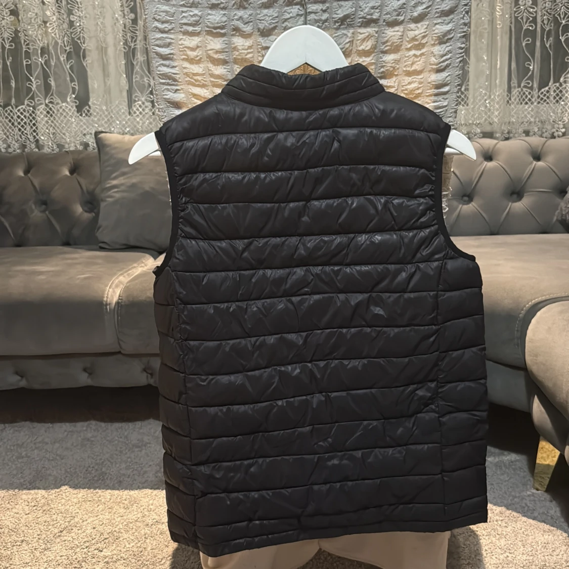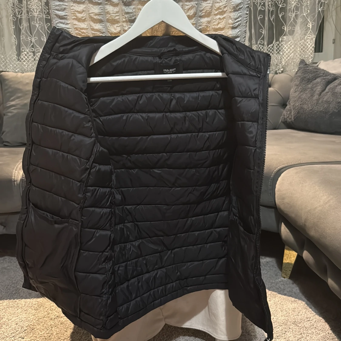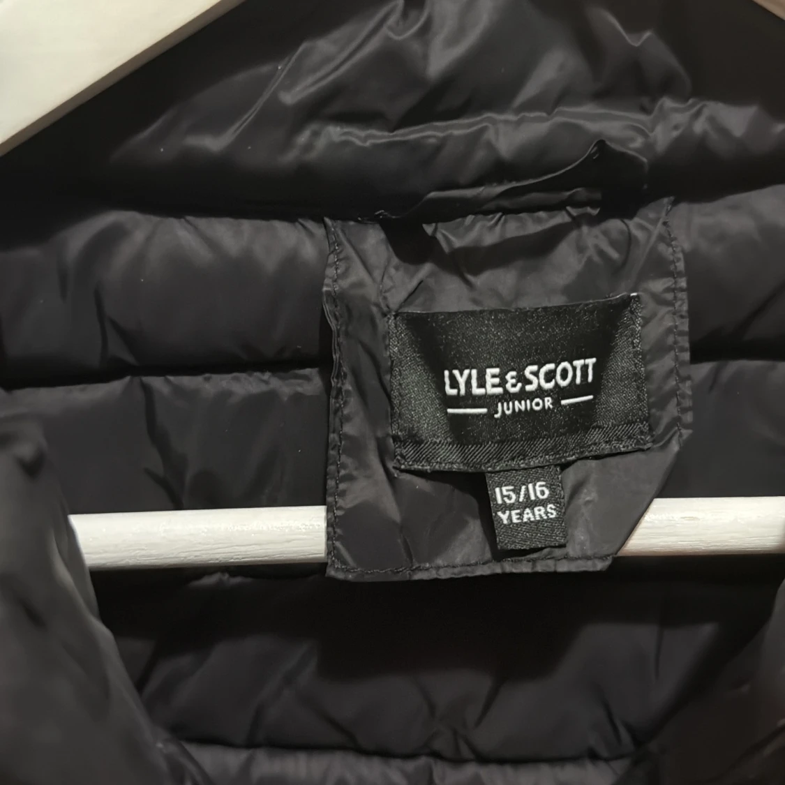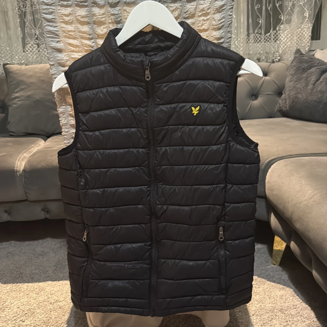 Svart dunväst från Lyle & Scott Junior med gul logotyp på bröstet. Västen har quiltad design, två sidofickor med dragkedja och hög krage. Perfekt för lager-på-lager och snygg till hoodie eller t-shirt.