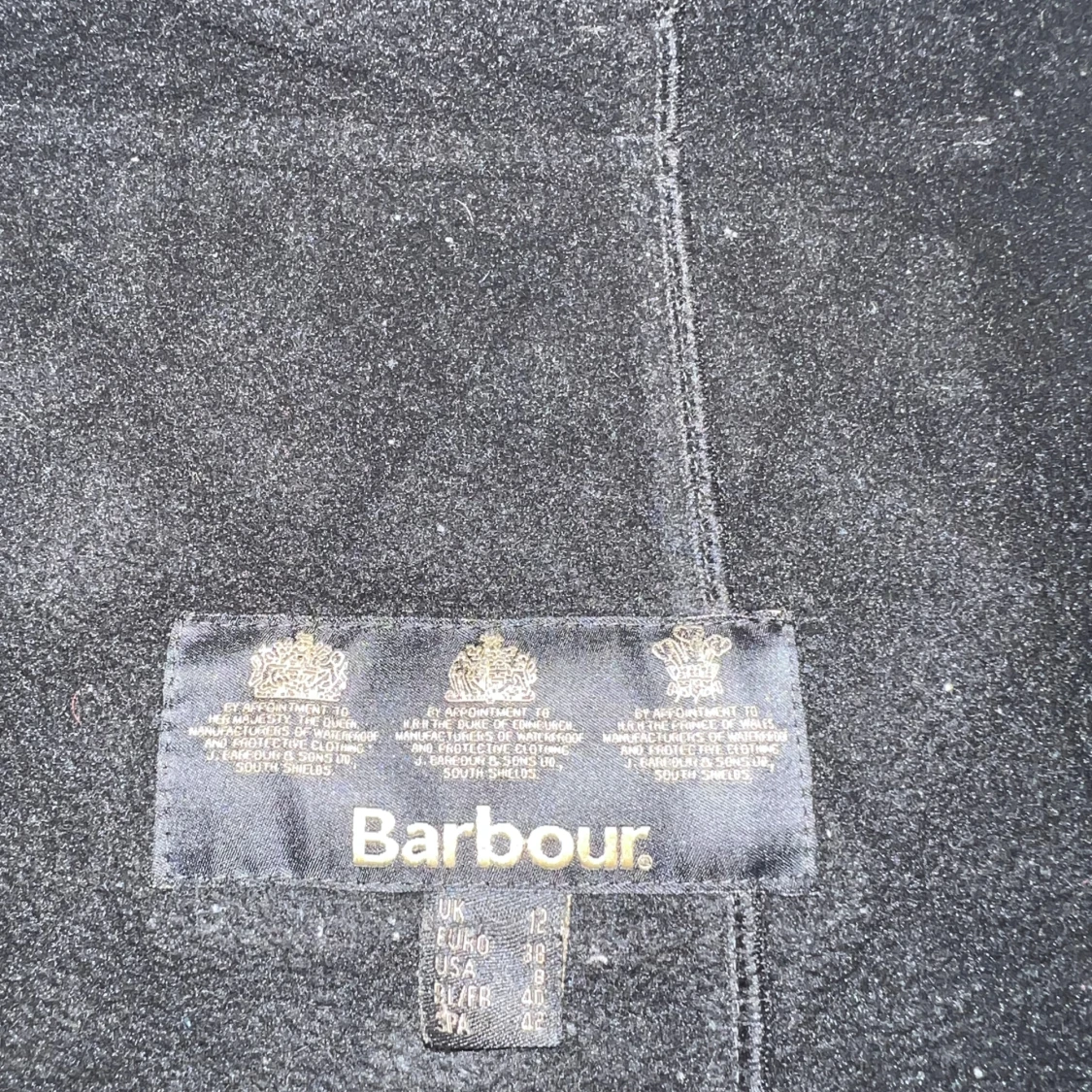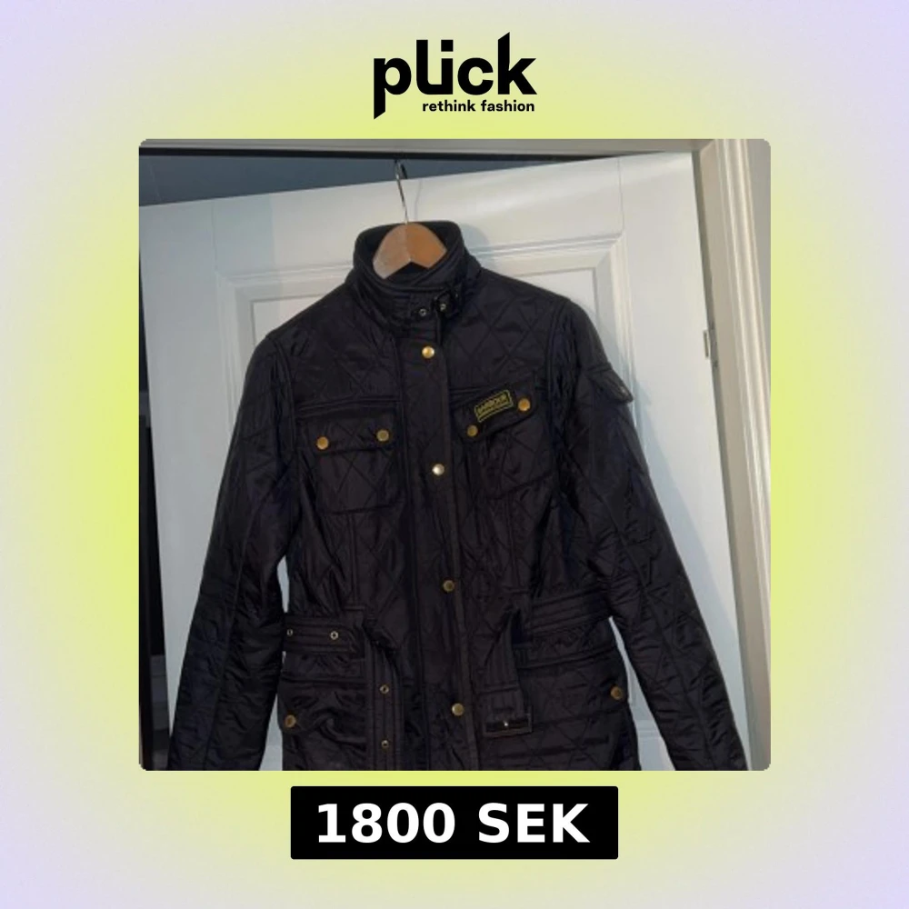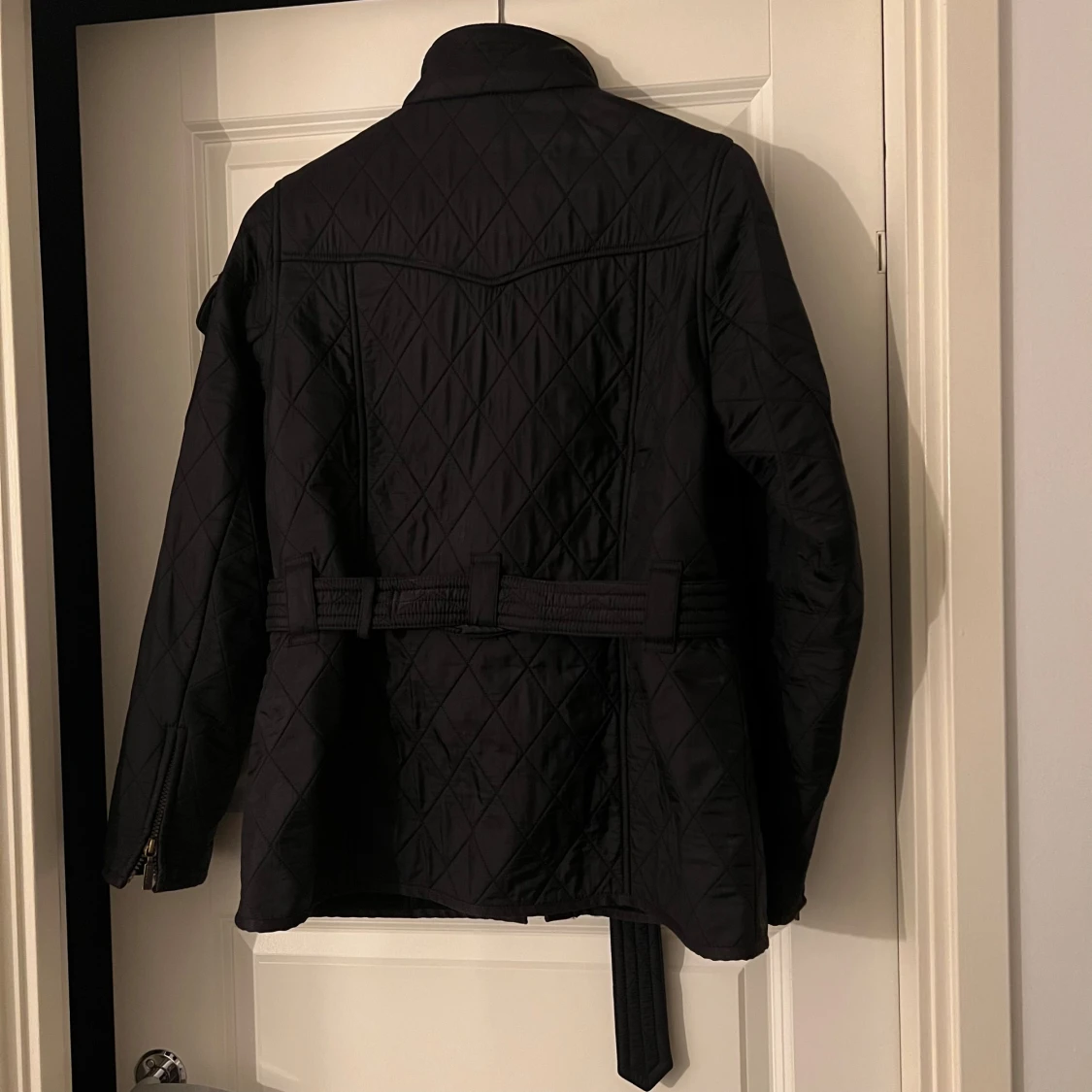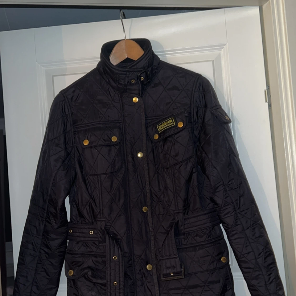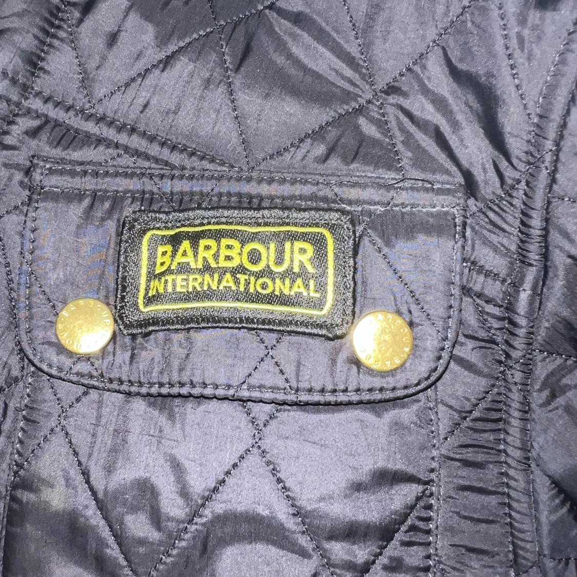 Quiltad svart jacka från Barbour International med guldiga knappar, hög krage och bälte i midjan. Jackan har flera fickor framtill och klassisk Barbour-logga på bröstet. Perfekt för dig som vill ha en stilren och tidlös look.