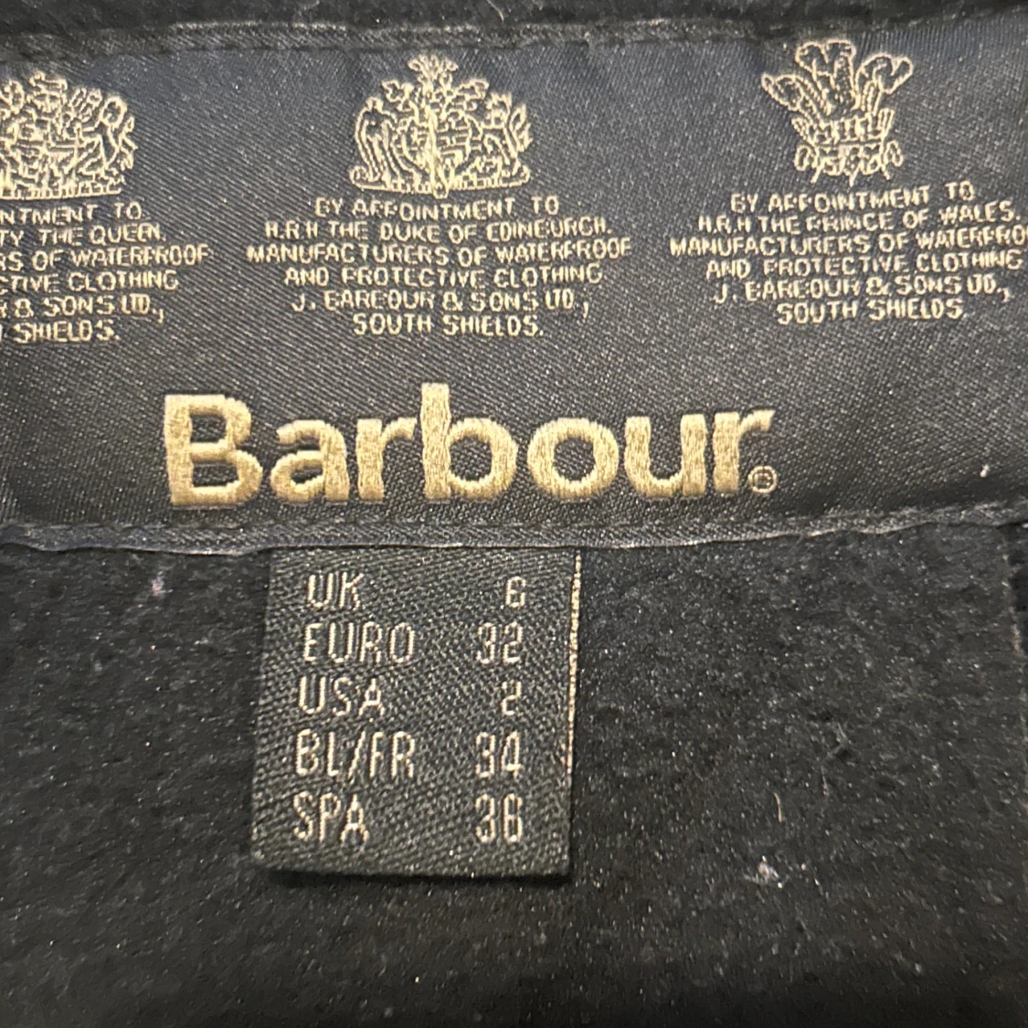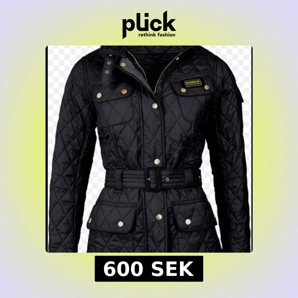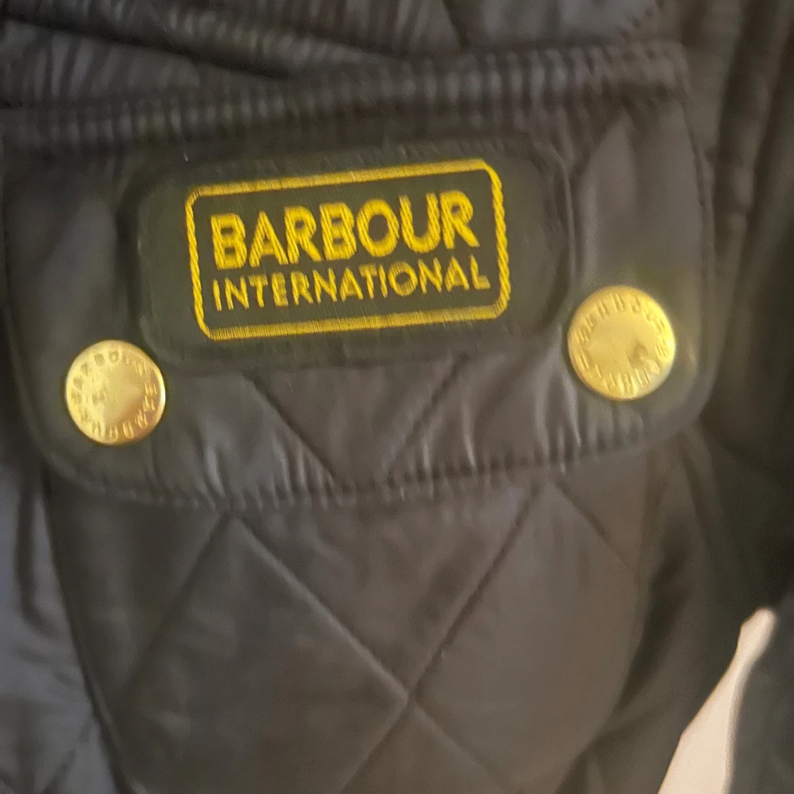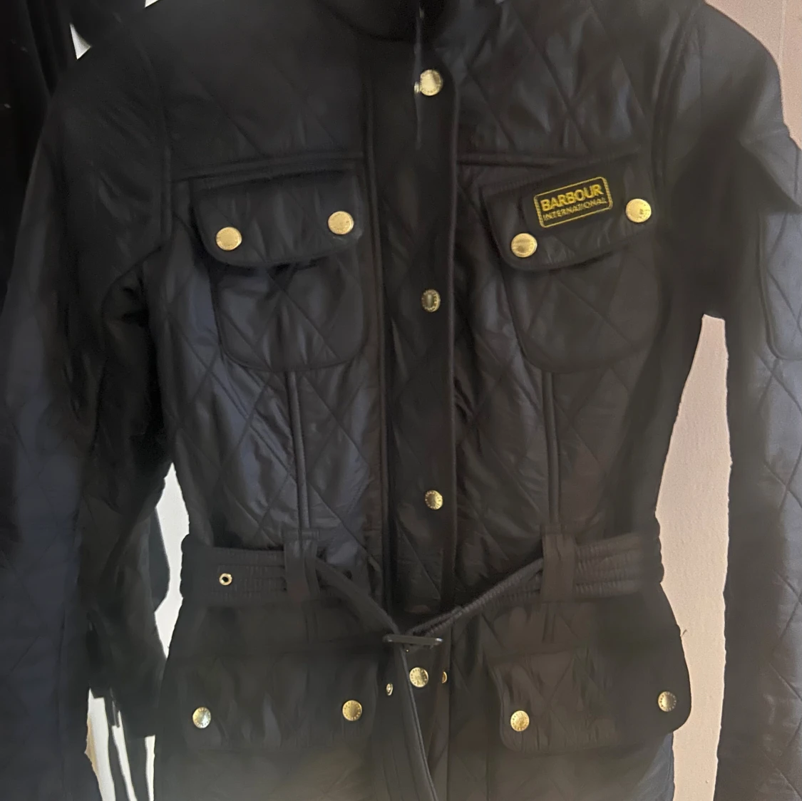 Snygg svart quiltad jacka från Barbour International med bälte i midjan, guldiga knappar och flera fickor. Jackan har lång ärm, hög krage och klassisk Barbour-logga på bröstet. Perfekt för dig som gillar stilren och tidlös design.
