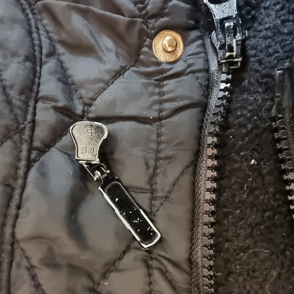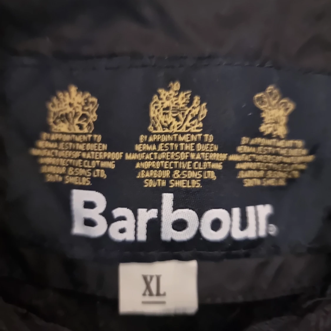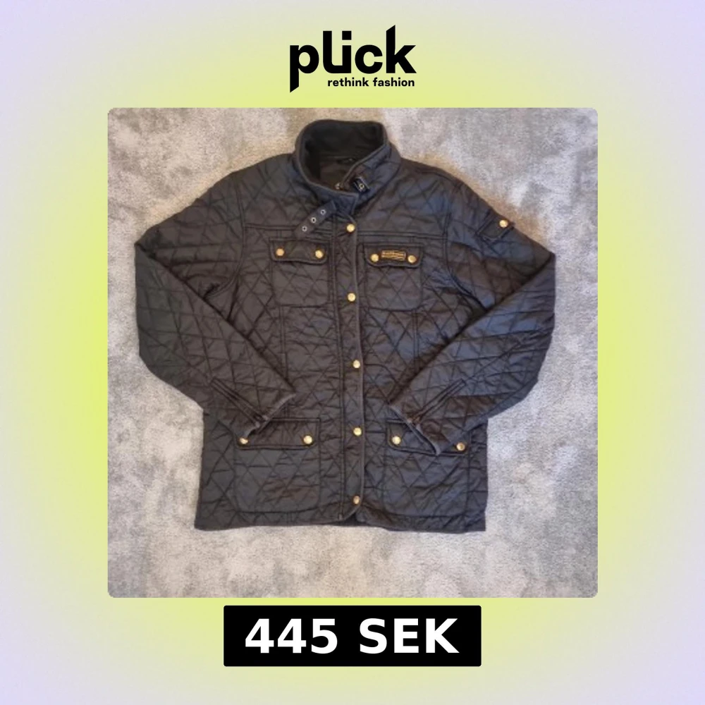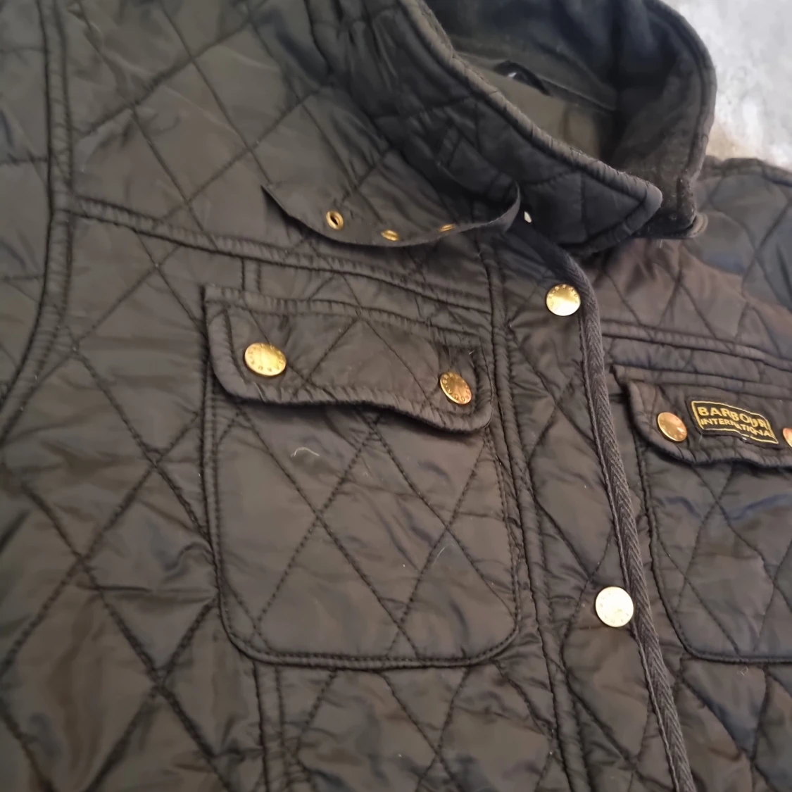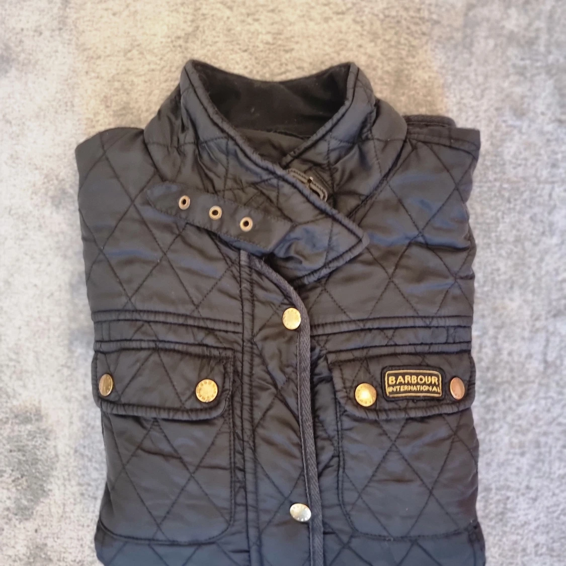 Säljer en svart quiltad jacka från Barbour med guldiga knappar och hög krage med spänne. Jackan har fyra fickor framtill och Barbour-logga på bröstet. Perfekt för kyliga dagar och snygg till många outfits en dragkedja är borta och går inte att stänga med de men man kan stänga med jnapparna. Pris kan sänkas
