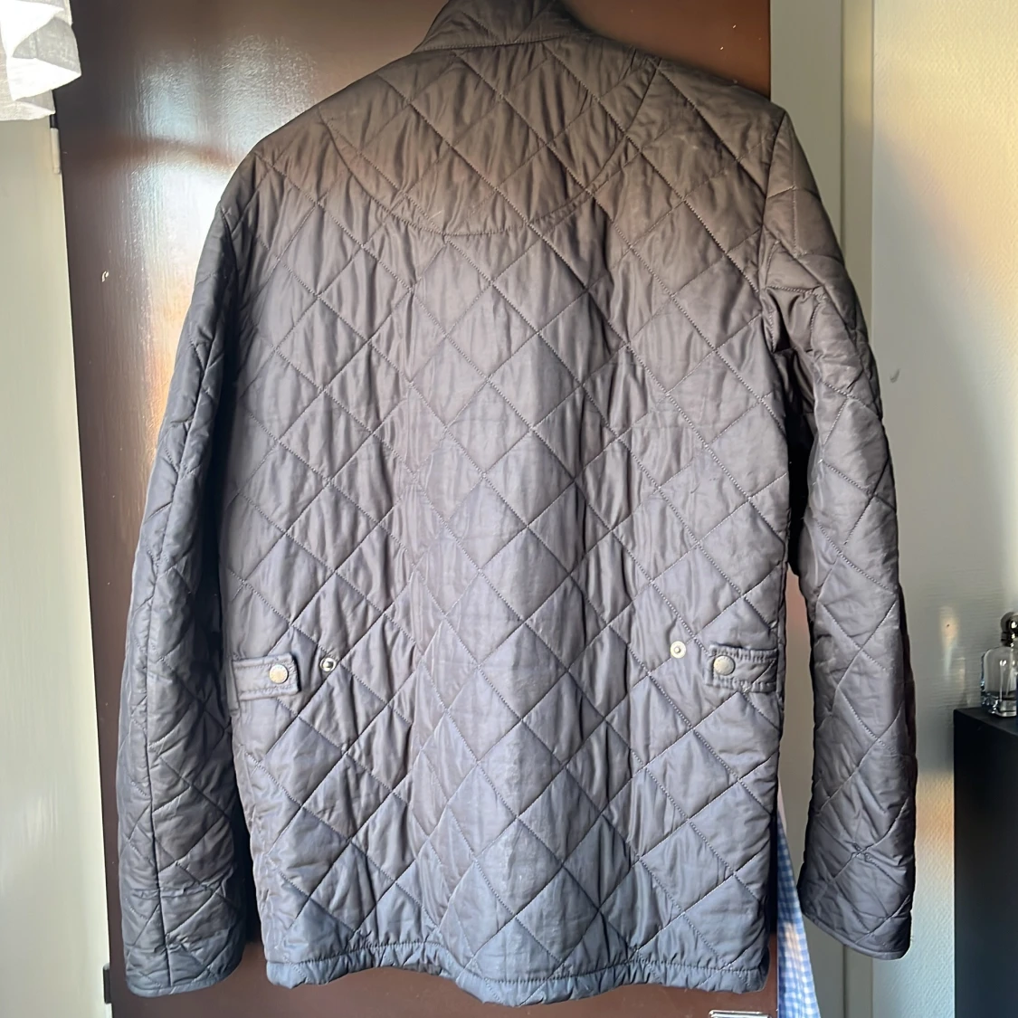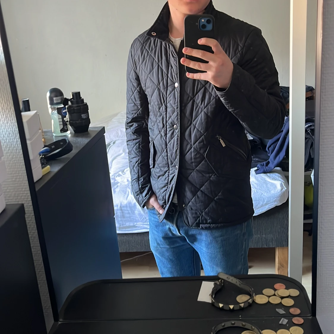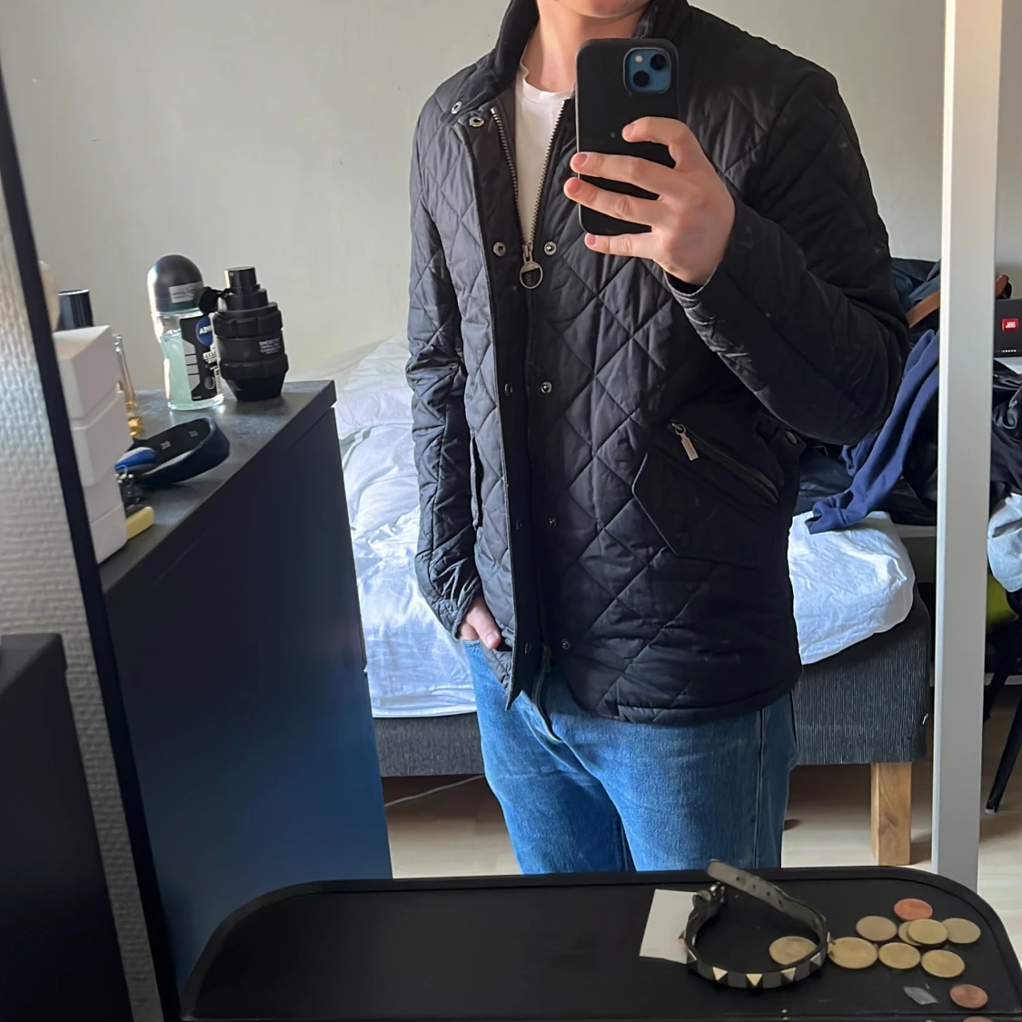Säljer en stilren svart quiltad jacka från Barbour. Jackan har en klassisk design med dragkedja och knappar framtill samt praktiska fickor med dragkedja. Perfekt för kyligare dagar.