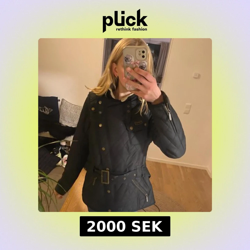 Quiltad svart jacka från Barbour International med bälte i midjan, dragkedjor och knappar i guldton. Jackan har hög krage med mysig foderkant och flera fickor framtill. Perfekt för dig som vill ha en klassisk men edgy look.