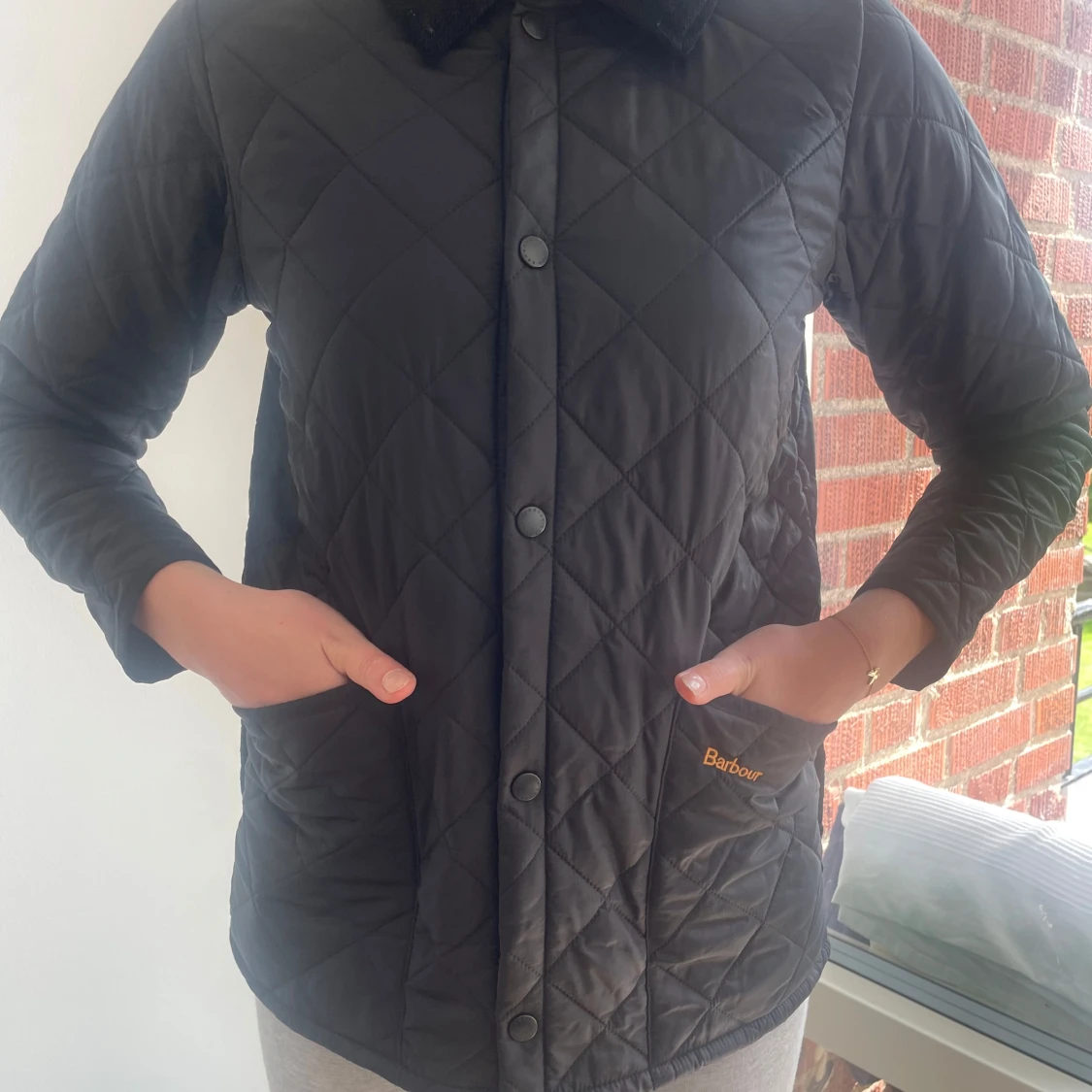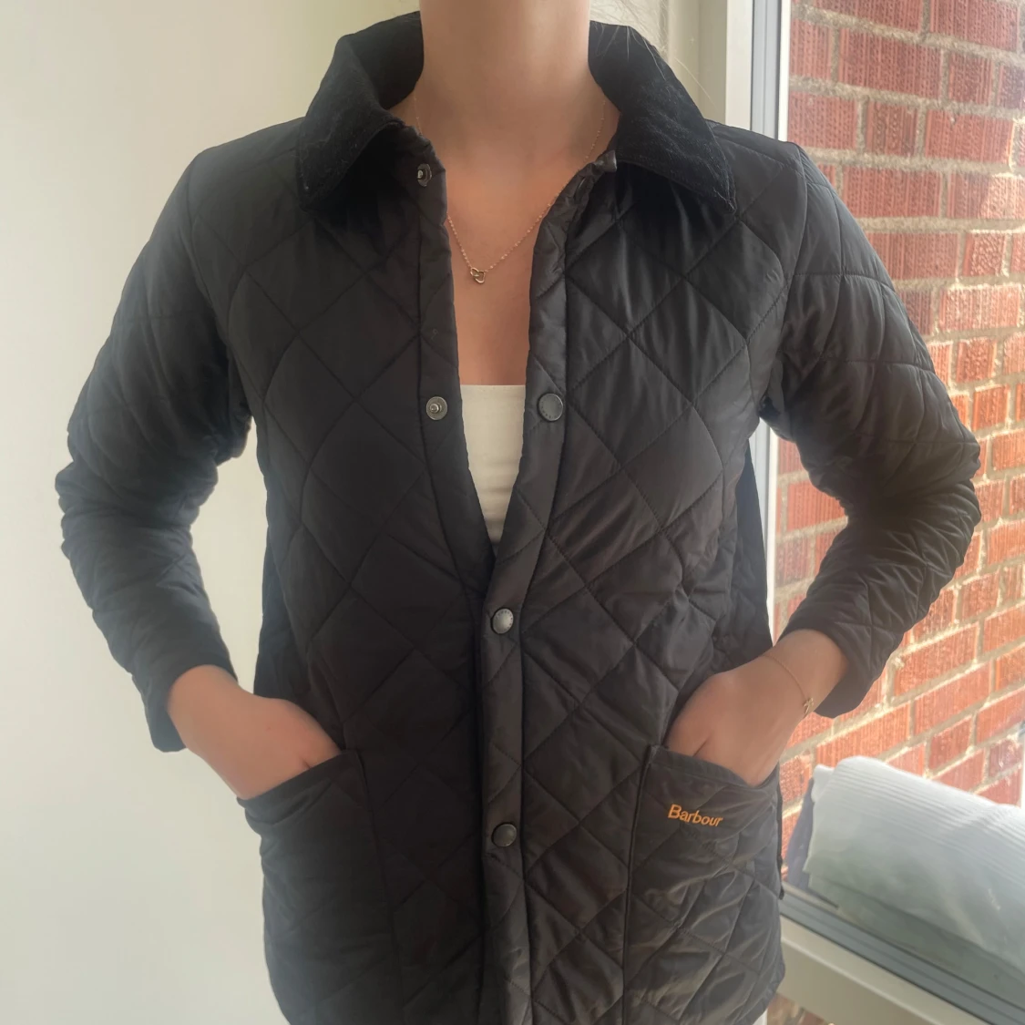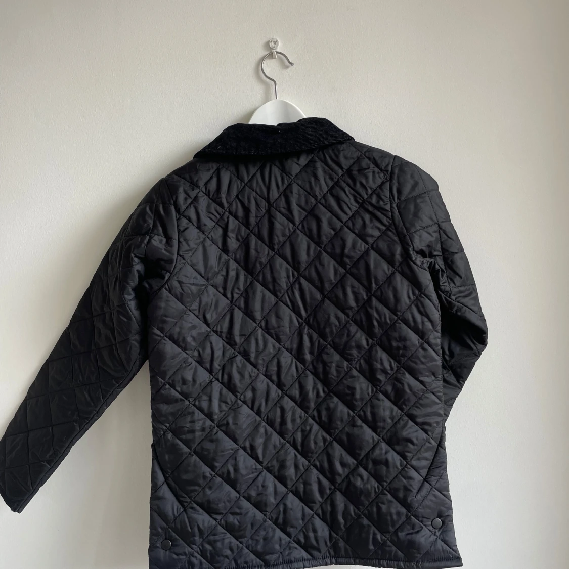 Quiltad svart jacka från Barbour med klassisk krage i manchester och tryckknappar framtill. Jackan har två stora fickor med Barbour-logga broderad på ena sidan. Perfekt för höst och vår, med tidlös design och skön passform.