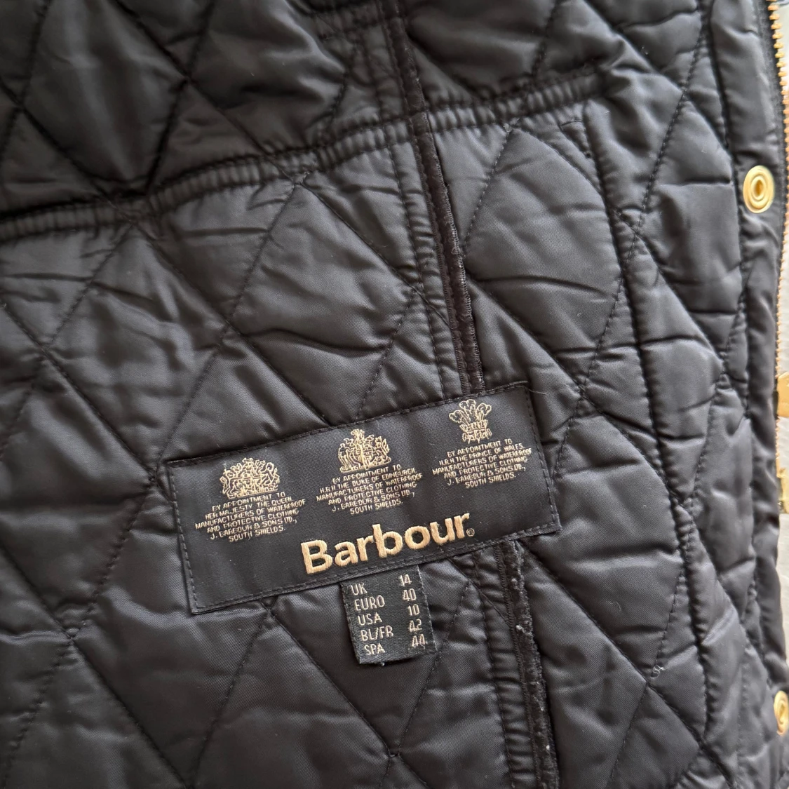Säljer en svart quiltad jacka från Barbour med guldiga detaljer, bälte i midjan och hög krage. Jackan har flera fickor med knappar och dragkedja framtill. Perfekt för dig som vill ha en klassisk och stilren look.