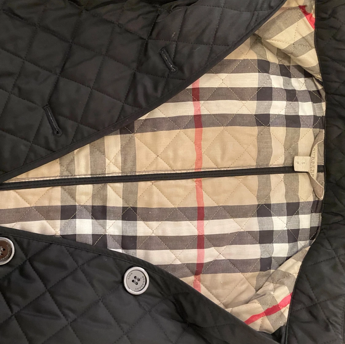 Säljer en svart quiltad jacka från Burberry med klassiskt rutigt foder i beige, rött och svart. Jackan har knappar framtill, långa ärmar och snygga uppvikta muddar som visar det ikoniska mönstret.