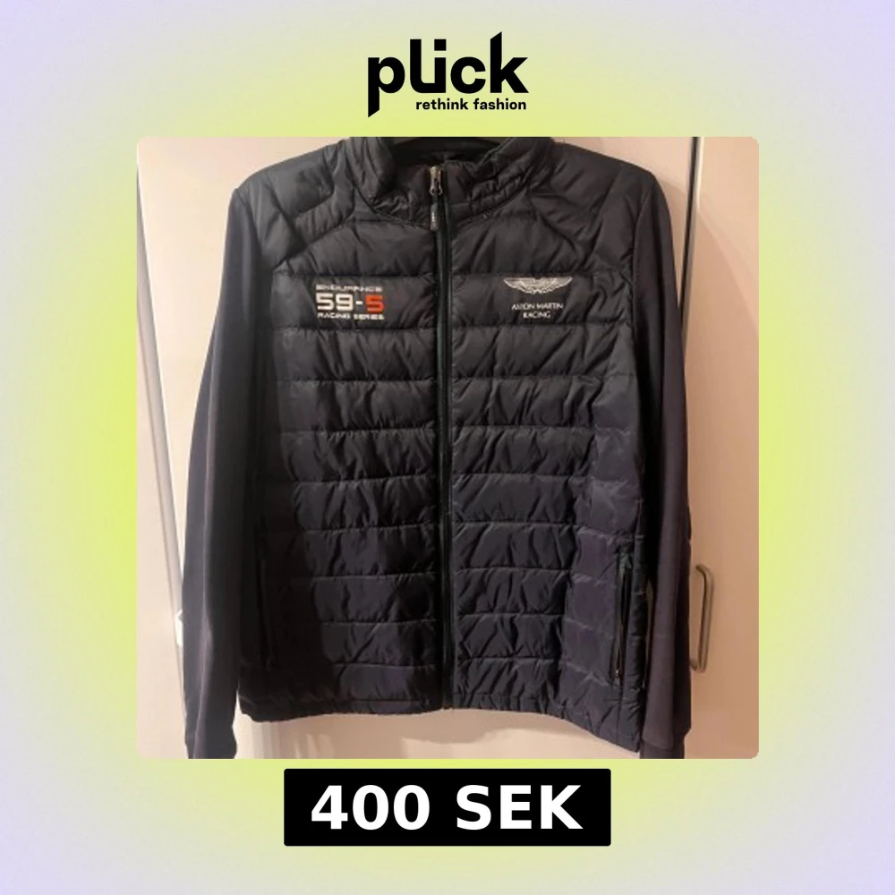 Säljer en svart quiltad jacka från Aston Martin Racing med dragkedja framtill. Jackan har broderade detaljer och långa ärmar. Perfekt för bilentusiaster som vill ha en stilren look.