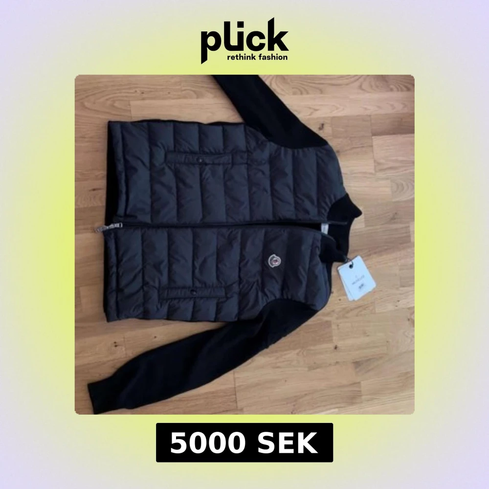 Snygg svart quiltad jacka från Moncler med långa ärmar och dragkedja. Perfekt för kyligare dagar med stilren design och Moncler-logga på bröstet. jag har använt denna cardigan 3 gånger och den är i väldigt bra skick ja köpte den från nk då jag har kvitto.