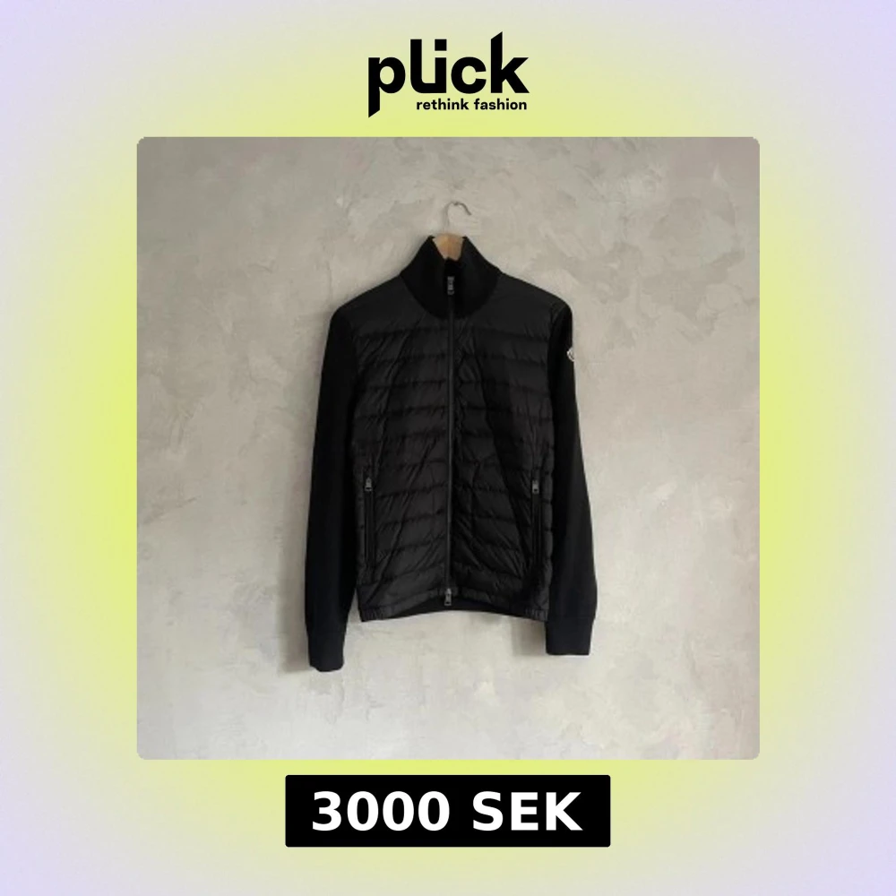 Snygg svart quiltad jacka från Moncler med dragkedja framtill. Jackan har långa ärmar och en stilren design som passar perfekt för kyligare dagar. Den har en diskret logga på ärmen och ribbade muddar för extra komfort.