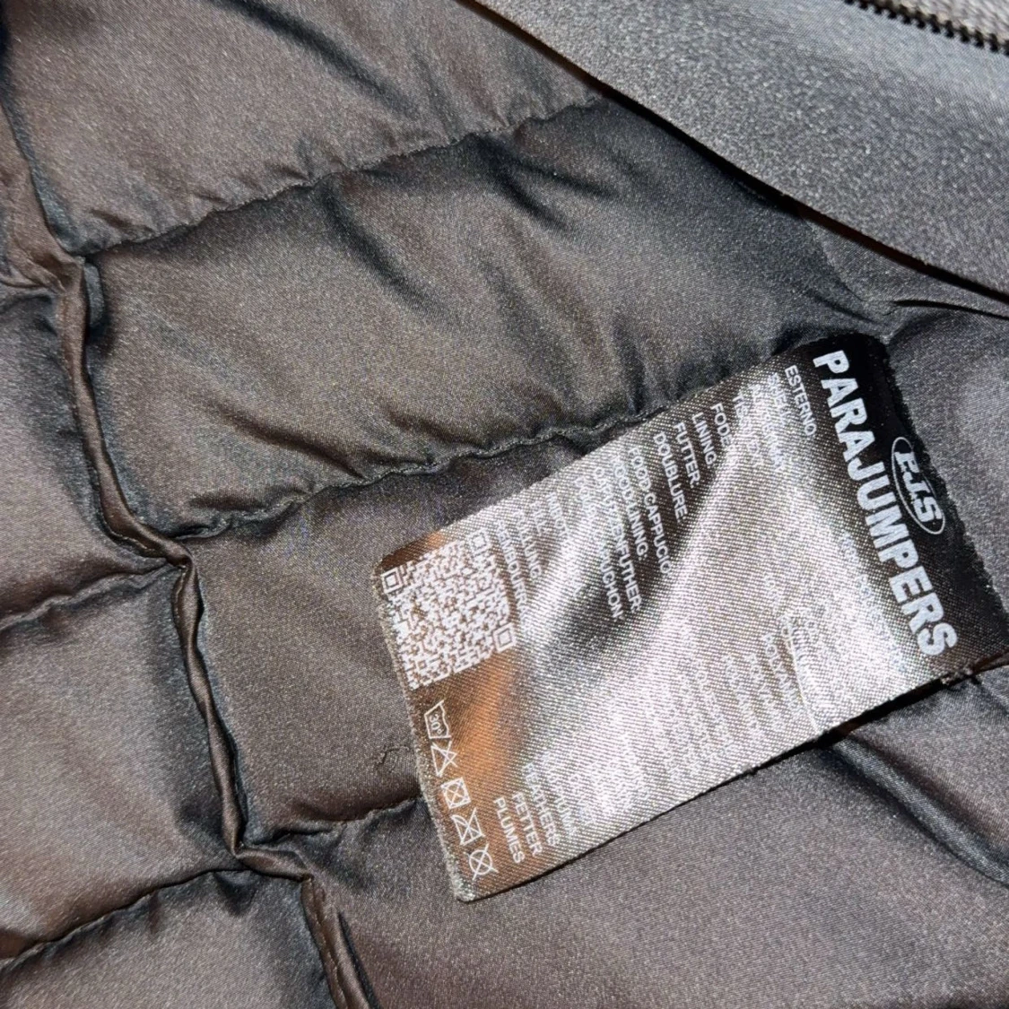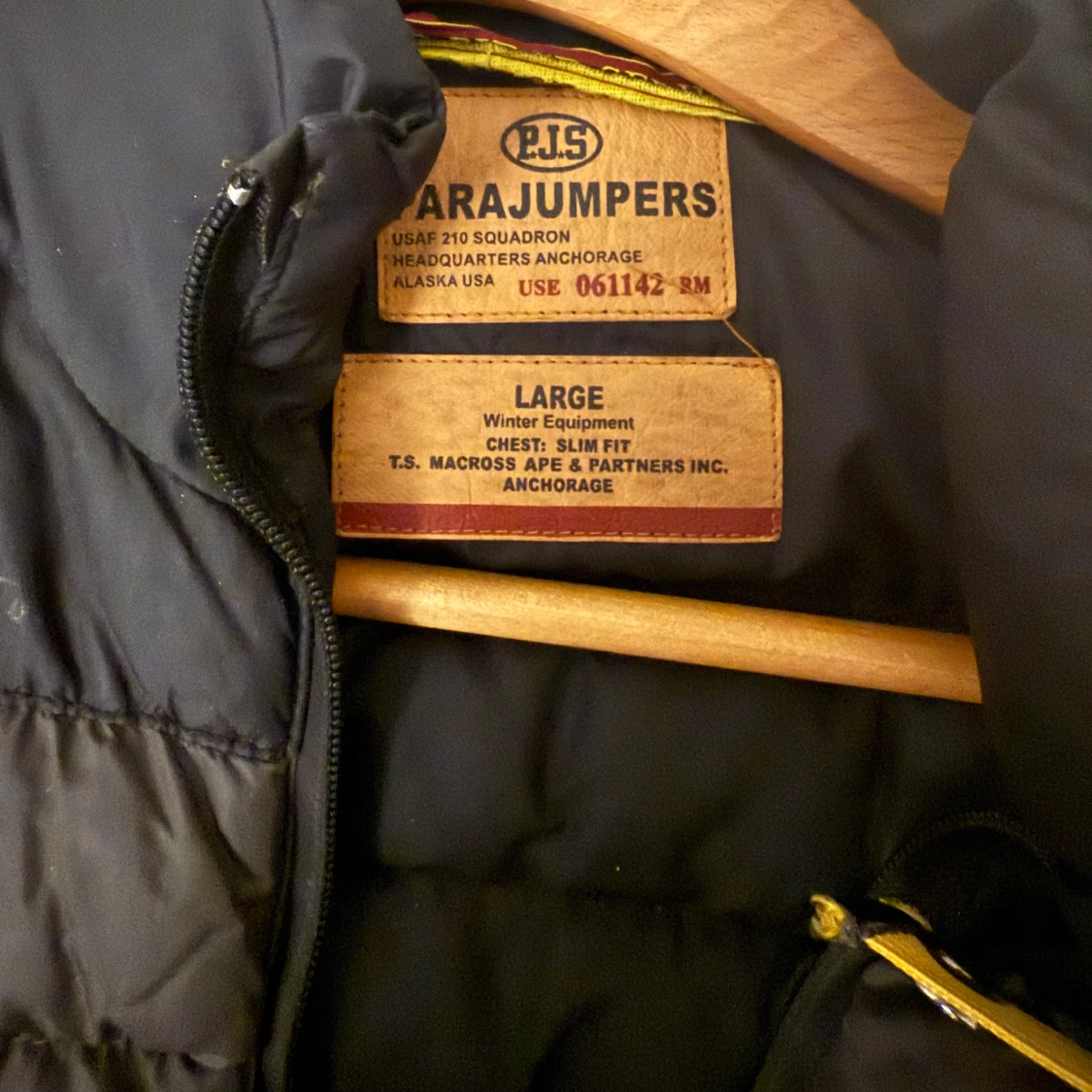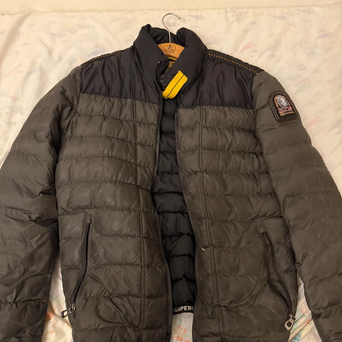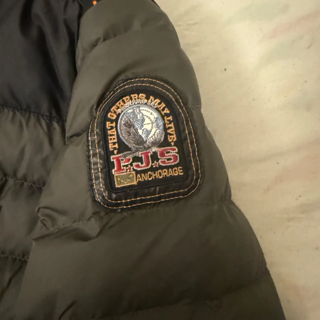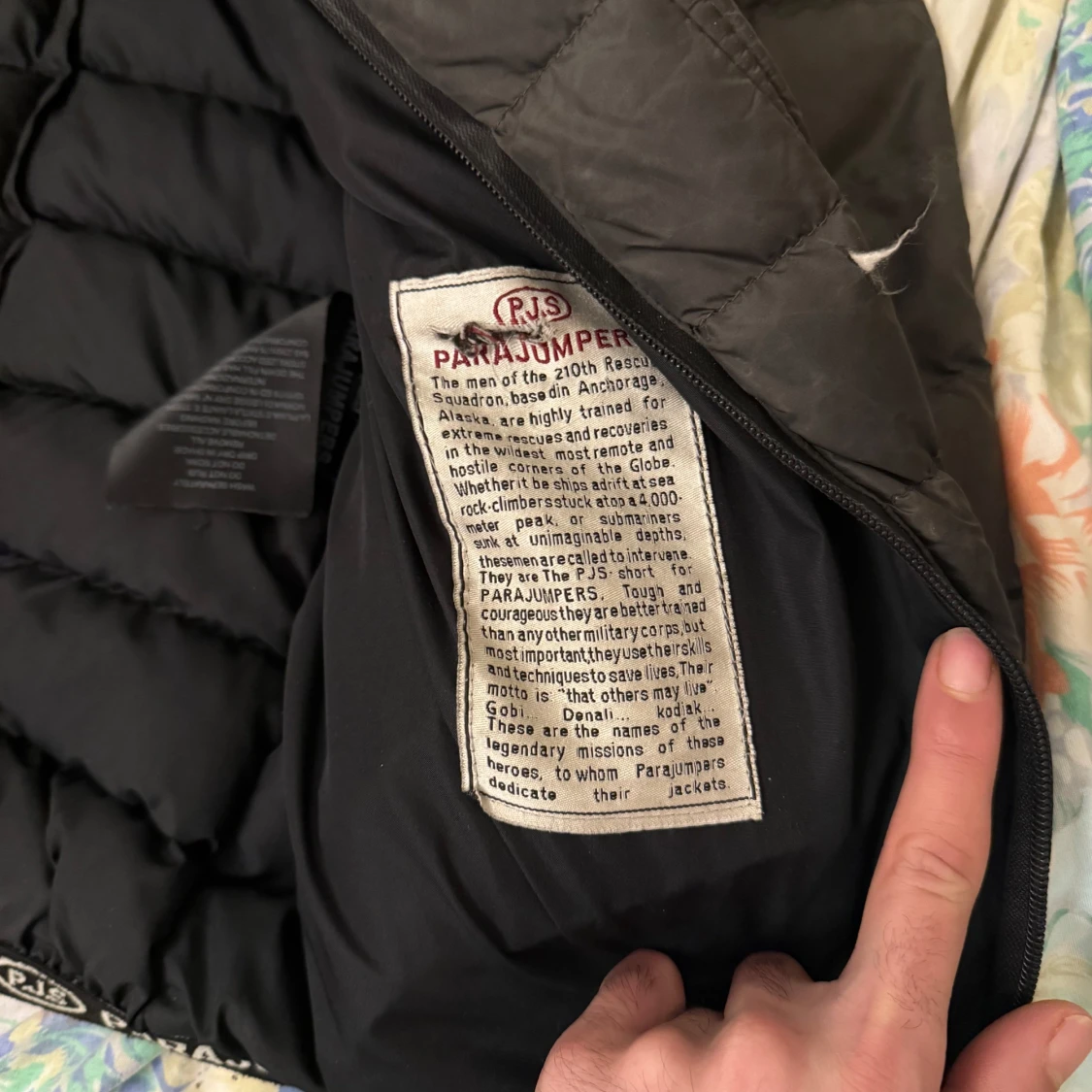 Säljer en snygg svart quiltad jacka från Parajumpers med broderad logga på ärmen. Jackan har en dragkedja framtill och är perfekt för kyligare väder. Den har långa ärmar och en stilren design.