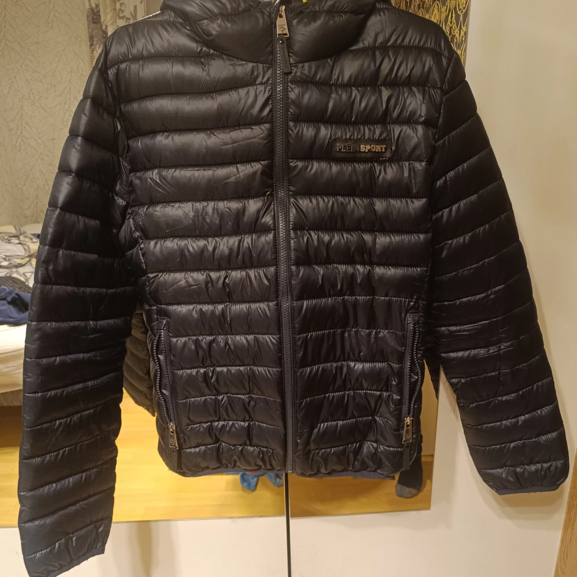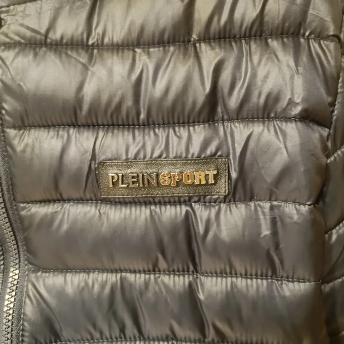 Snygg svart quiltad jacka från Plein Sport med gul logga på ryggen och huvan. Jackan har dragkedja framtill och två sidofickor med dragkedjor. Perfekt för kyligare dagar.