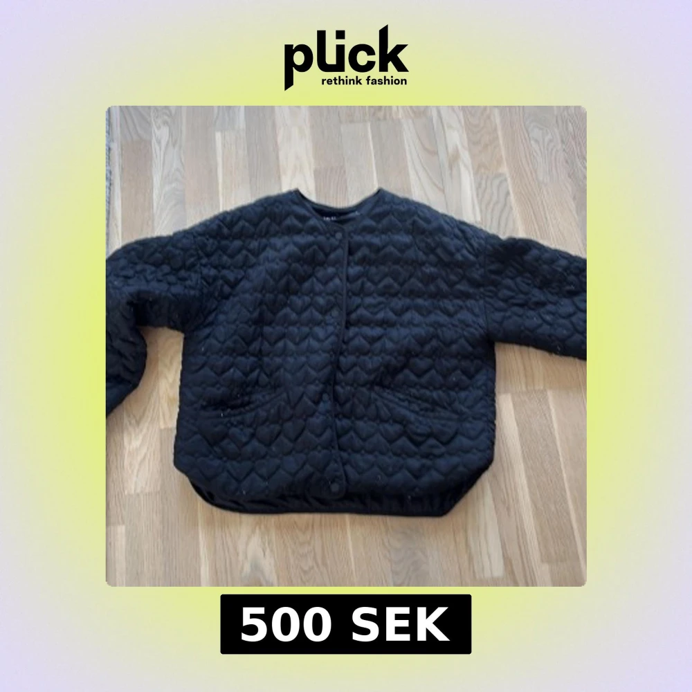 Quiltad svart jacka från Zara med hjärtformat mönster. Jackan har rund halsringning, tryckknappar framtill och två snedställda fickor. Oversized passform och långärmad modell, perfekt för lager-på-lager-stil.
