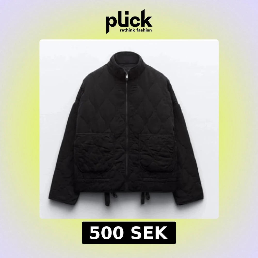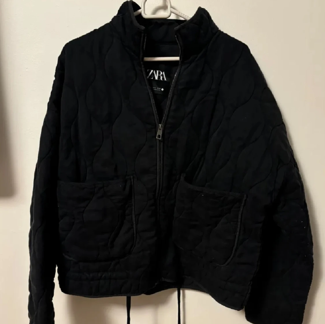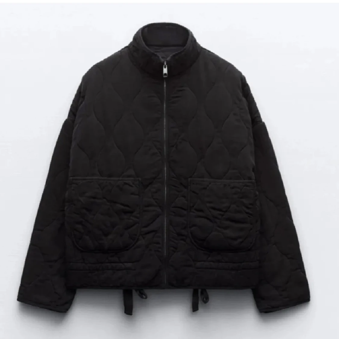 Snygg svart quiltad jacka från Zara med dragkedja framtill och stora fickor. Jackan har en hög krage och justerbara snören i nederkant för en anpassad passform.