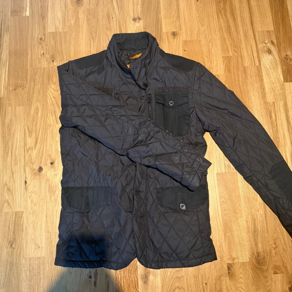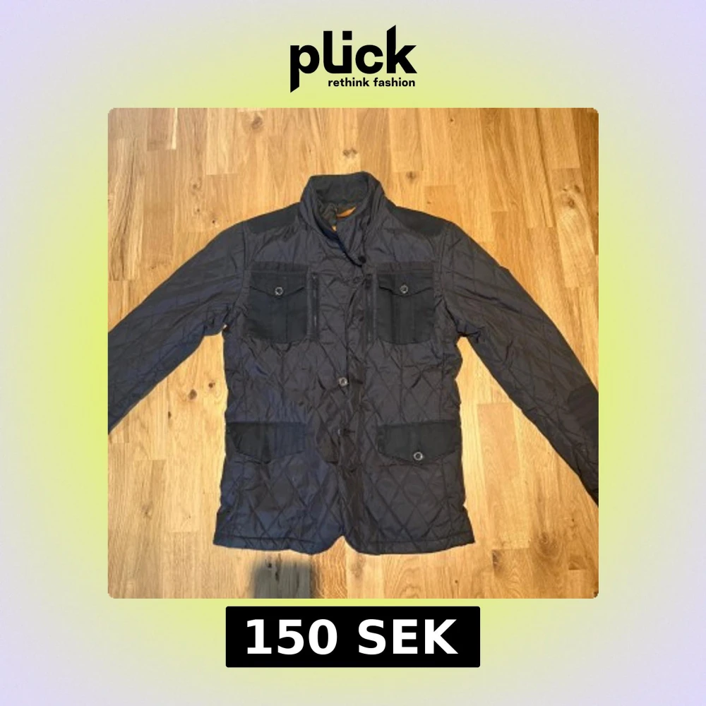 Säljer en svart quiltad jacka med hög krage och fyra framfickor med lock och knappdetaljer. Jackan har lång ärm och stängs med både dragkedja och knappar. Perfekt för kyligare dagar.