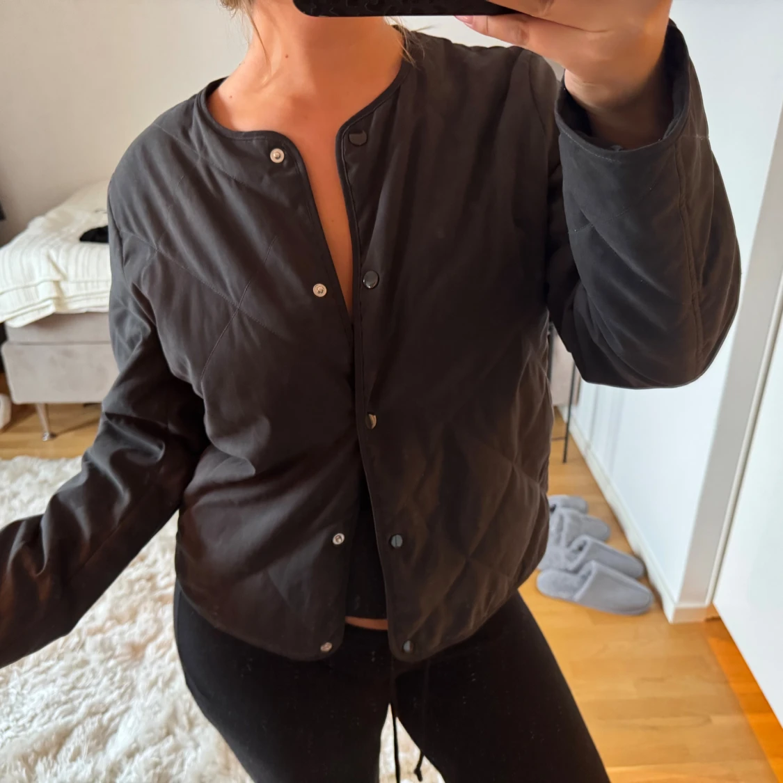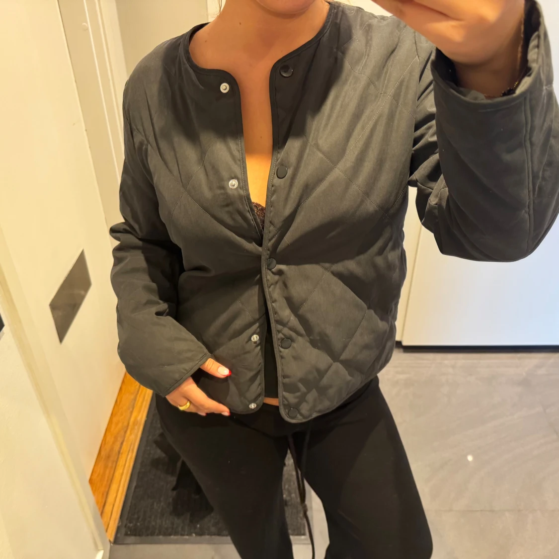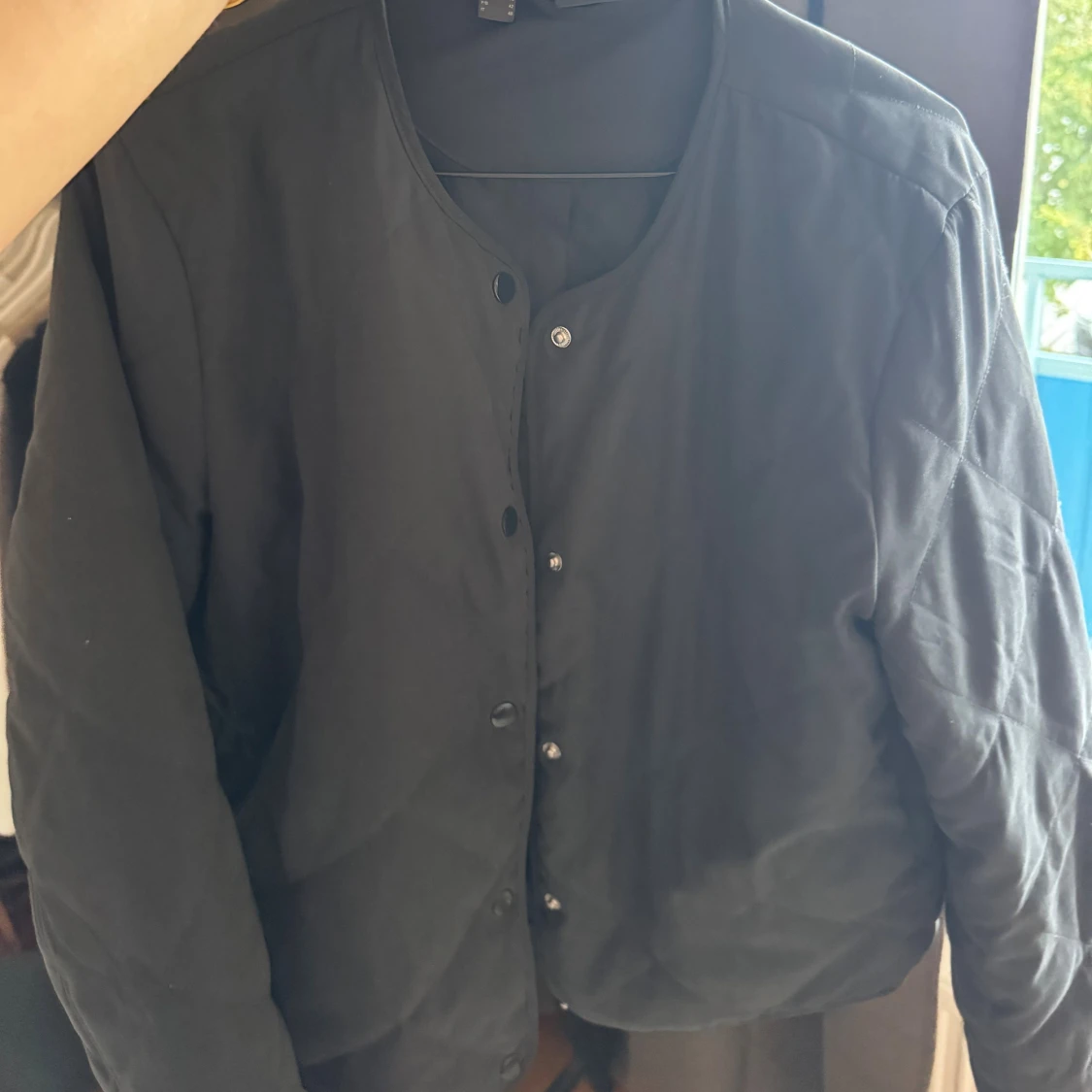 Säljer en svart quiltad jacka med rund halsringning och tryckknappar framtill. Jackan har en enkel, stilren design och är lätt vadderad. Perfekt för lager-på-lager och funkar till många olika outfits. Nyskick!