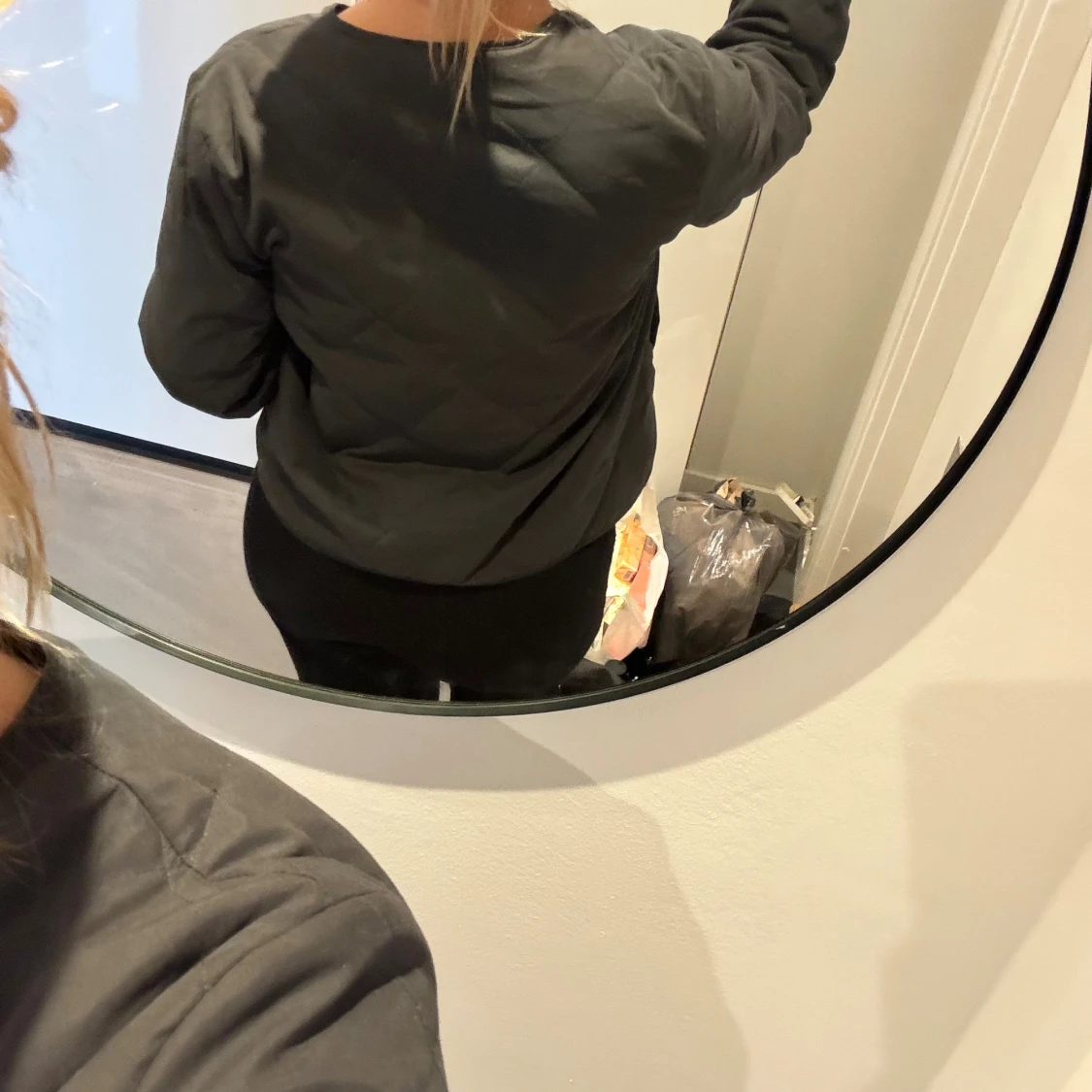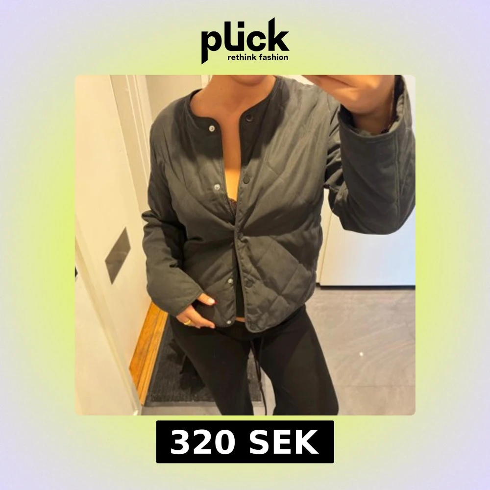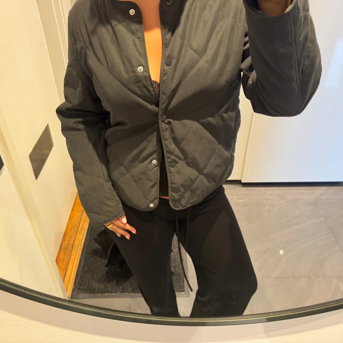 Säljer en svart quiltad jacka med rund halsringning och tryckknappar framtill. Jackan har en enkel, stilren design och är lätt vadderad. Perfekt för lager-på-lager och funkar till många olika outfits. Nyskick!