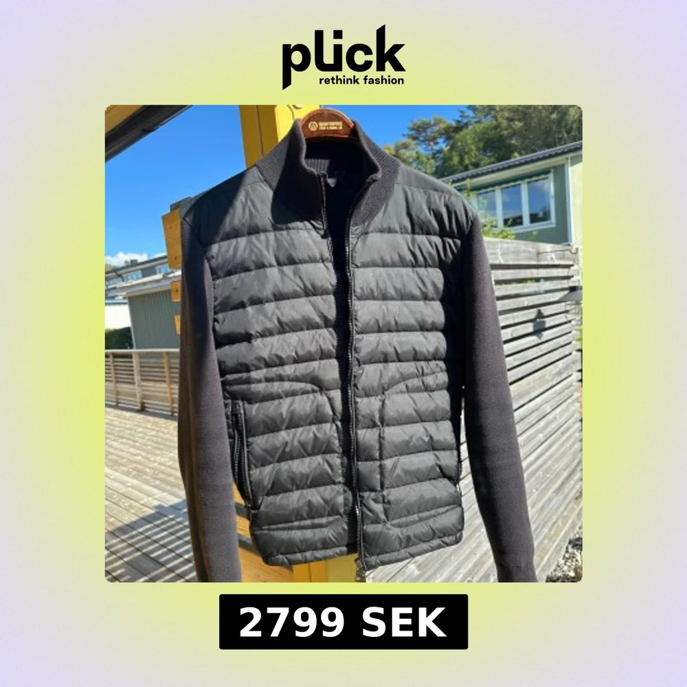 Svart pufferjacka från Moncler med quiltad framsida och stickade ärmar. Jackan har ribbad krage, dragkedja framtill och Moncler-logga på ärmen. Snygg, stilren design som passar perfekt till höst och vinter. Materialmix av polyester och stickad bomull. Pris kan diskuteras