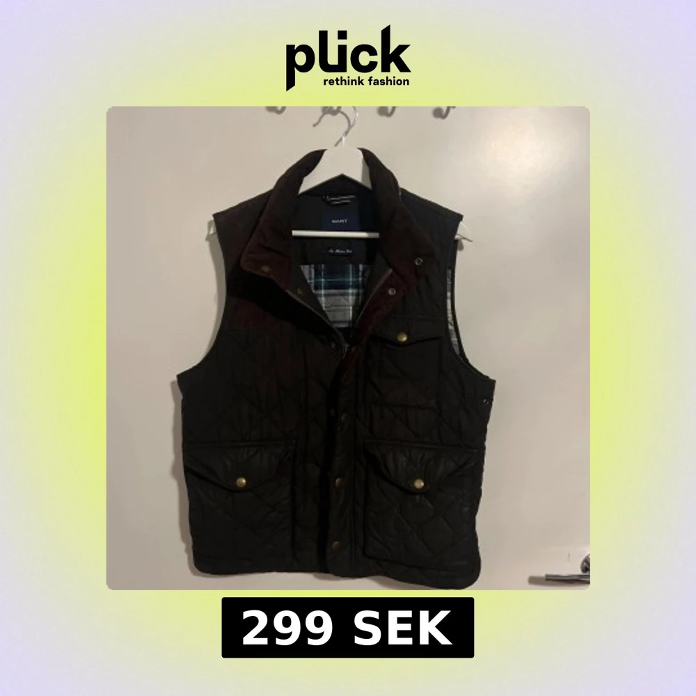 Snygg svart quiltad väst från Gant med rutigt innerfoder och bruna detaljer vid kragen. Västen har knappar framtill och två stora fickor med lock. Perfekt för lager-på-lager under kyliga dagar.