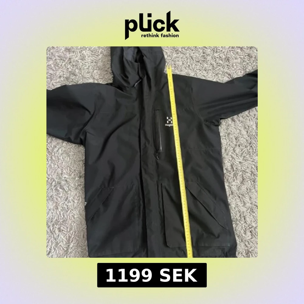 Säljer en svart regnjacka från Haglöfs med luva och dragkedja. Jackan har två stora fickor framtill och är perfekt för regniga dagar. Den har en meshfoder på insidan för extra komfort.