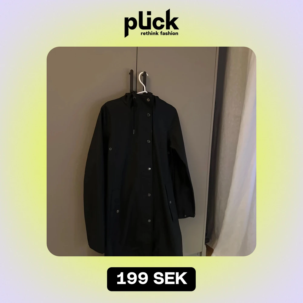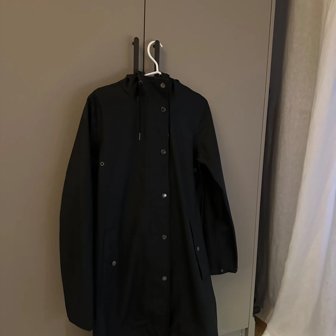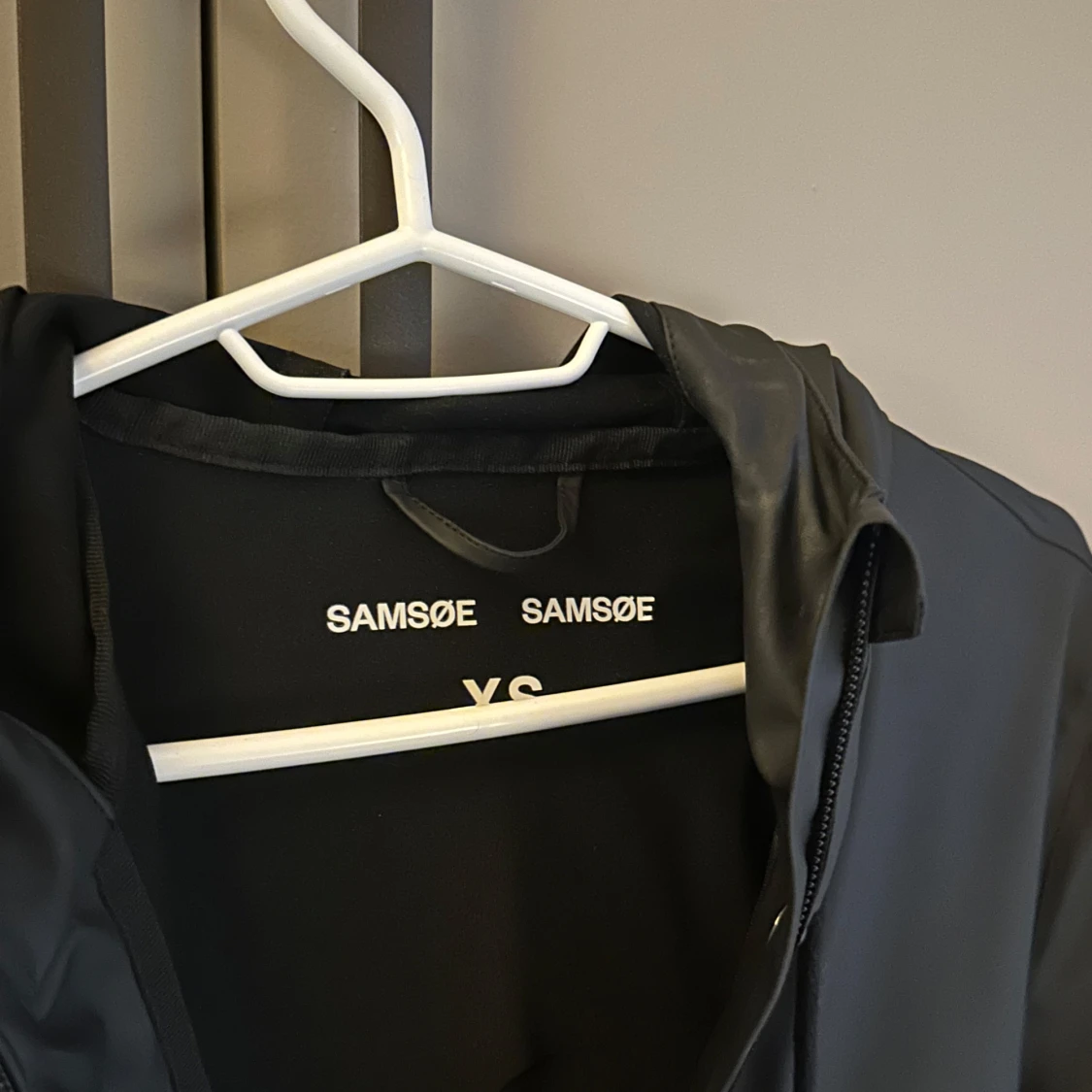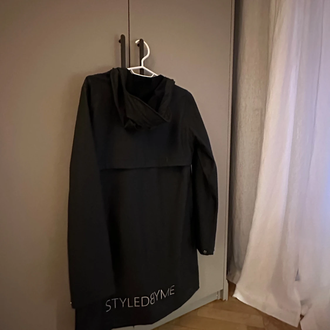 Säljer en stilren svart regnjacka från Samsøe Samsøe i storlek XS. Uppstripat ”styledbyme” på ryggen