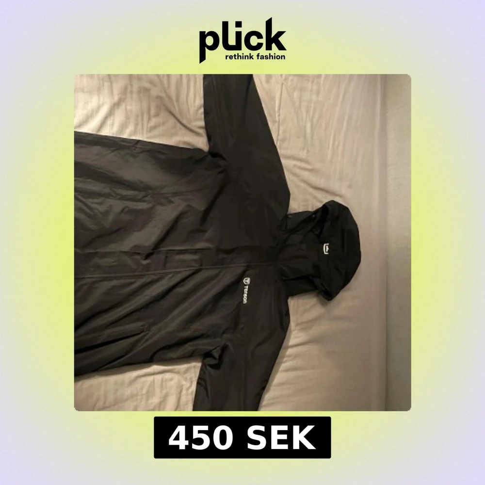 Säljer en svart regnjacka från Tenson med huva och dragkedja. Jackan är perfekt för regniga dagar och har en stilren design. Den är tillverkad i ett lätt och vattentätt material.
