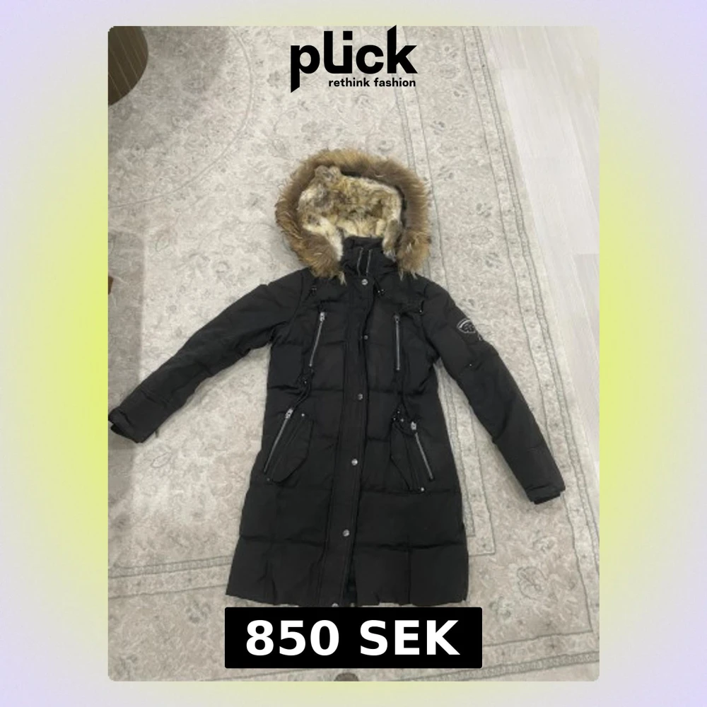Lång svart dunjacka från Rockandblue med snygg äkta päls runt huvan. Jackan har flera dragkedjor, tryckknappar och coola detaljer på ärmen. Perfekt för kalla vinterdagar och har en riktigt urban vibe. Äkta päls inuti luvan med.