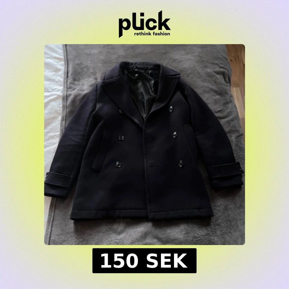 Snygg svart skepparkavaj med dubbelknäppning och bred krage. Jackan har långa ärmar och två fickor framtill. Perfekt för kyligare dagar.