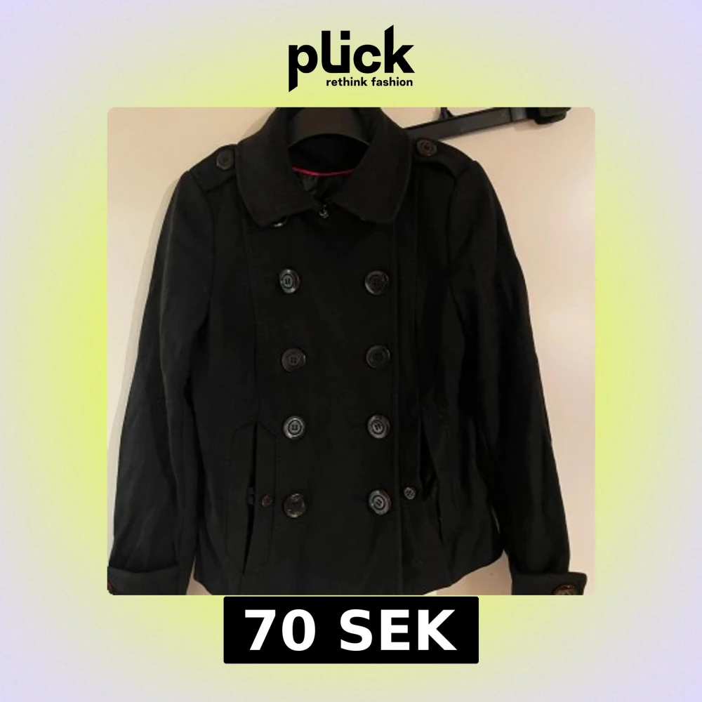 Svart skepparkavaj från DIVIDED med klassisk dubbelknäppning och stora svarta knappar. Jackan har krage, två fickor fram och långa ärmar med knappdetaljer vid mudden. Perfekt för dig som gillar stilren och tidlös look.