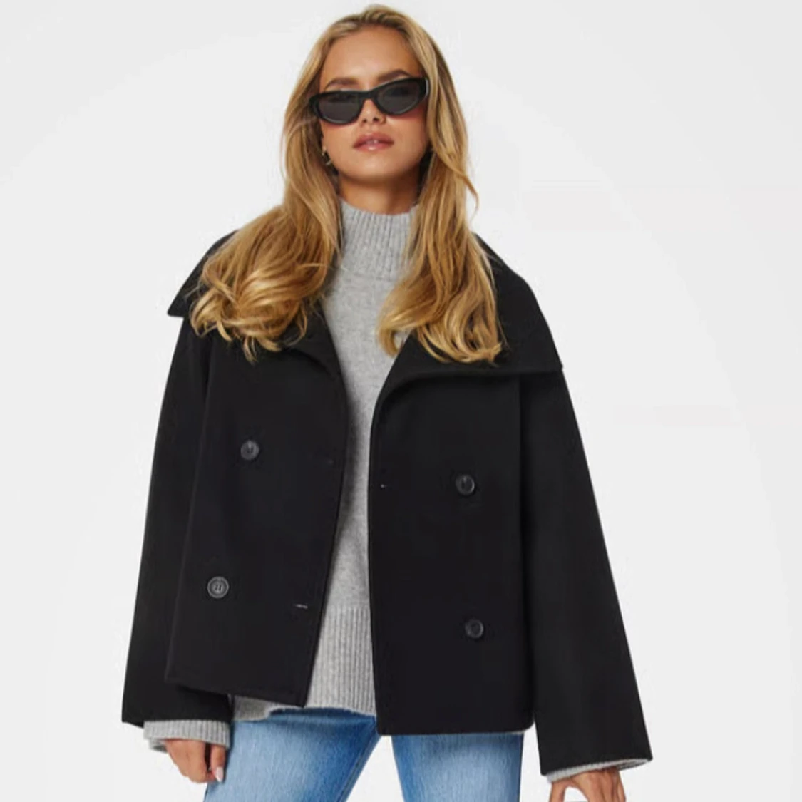 Säljer en svart kappa med bred krage och dubbelknäppning framtill. Köpt ifrån Gina tricot, I barn storleken 170 men passar som S, använts ett få tal gånger men är i ett fint skick utan några defekter!