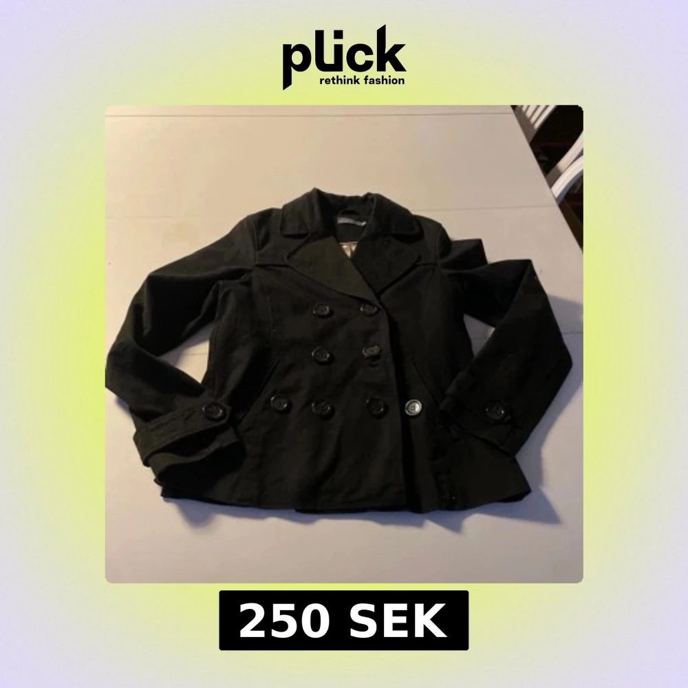 Stilren svart skepparkavaj med dubbelknäppning och bred krage. Jackan har långa ärmar med knappdetaljer vid mudden och är fodrad på insidan. Perfekt för dig som vill ha en klassisk look med lite edge.
