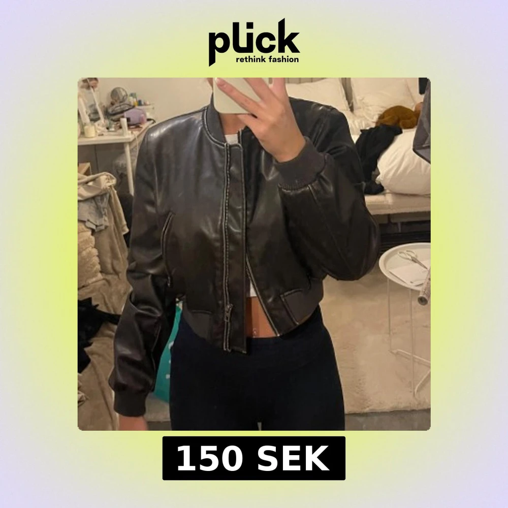 Snygg svart skinnjacka med dragkedja och ribbade muddar. Jackan är croppad och har en klassisk bomberjacka-stil. Perfekt för en cool och stilren look.