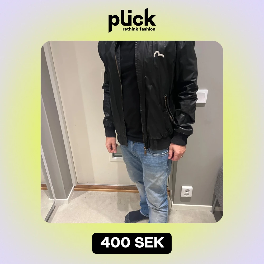 Säljer en snygg svart skinnjacka från märket Evisu. Storleken är XL men mer åt M