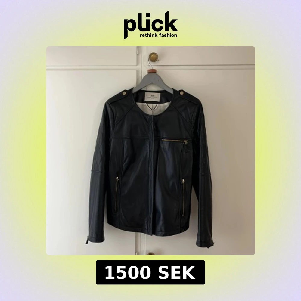 Snygg svart skinnjacka med rund halsringning och dragkedjor framtill. Jackan har dekorativa axelknappar och flera fickor med dragkedja. Perfekt för en cool och stilren look.