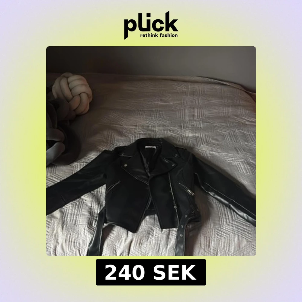 Snygg svart skinnjacka med klassisk bikerstil, silvriga dragkedjor, knappar och bälte i midjan🥰