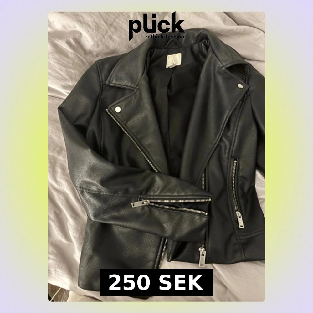 Snygg svart skinnjacka från H&M med klassisk bikerstil. Jackan har silvriga dragkedjor framtill och på ärmarna, bred krage och coola detaljer i metall. Perfekt för dig som vill ha en edgy look och gillar tidlös stil.