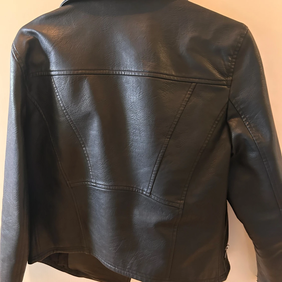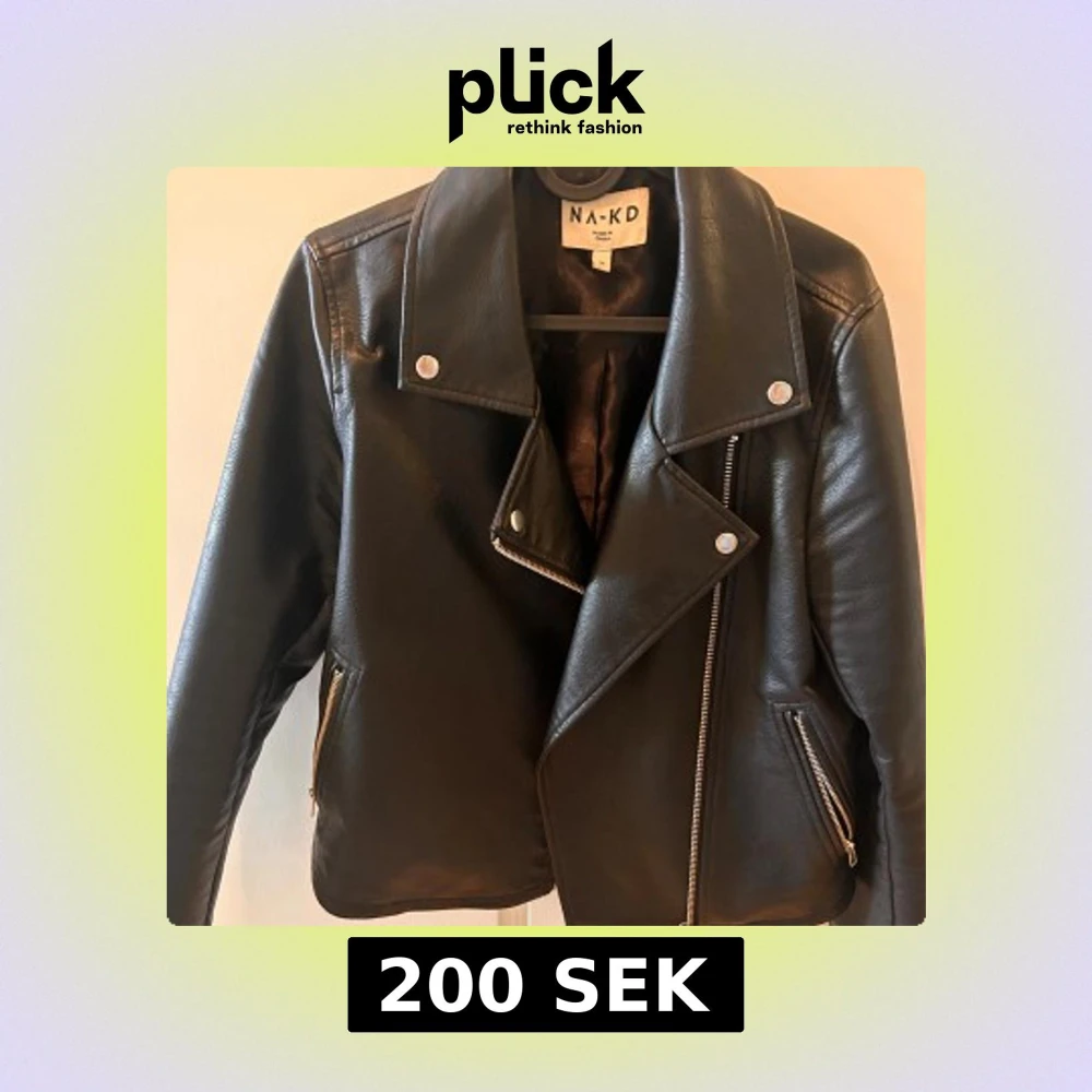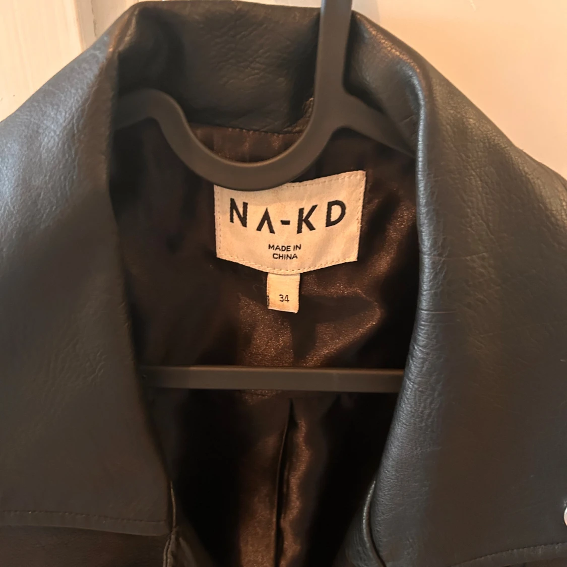 Snygg svart skinnjacka från NA-KD med klassisk bikerstil. Jackan har silvriga dragkedjor, bred krage och coola detaljer med tryckknappar. Storlek 34 men har lite större passform så passar även för dem som bär stk 36-38.