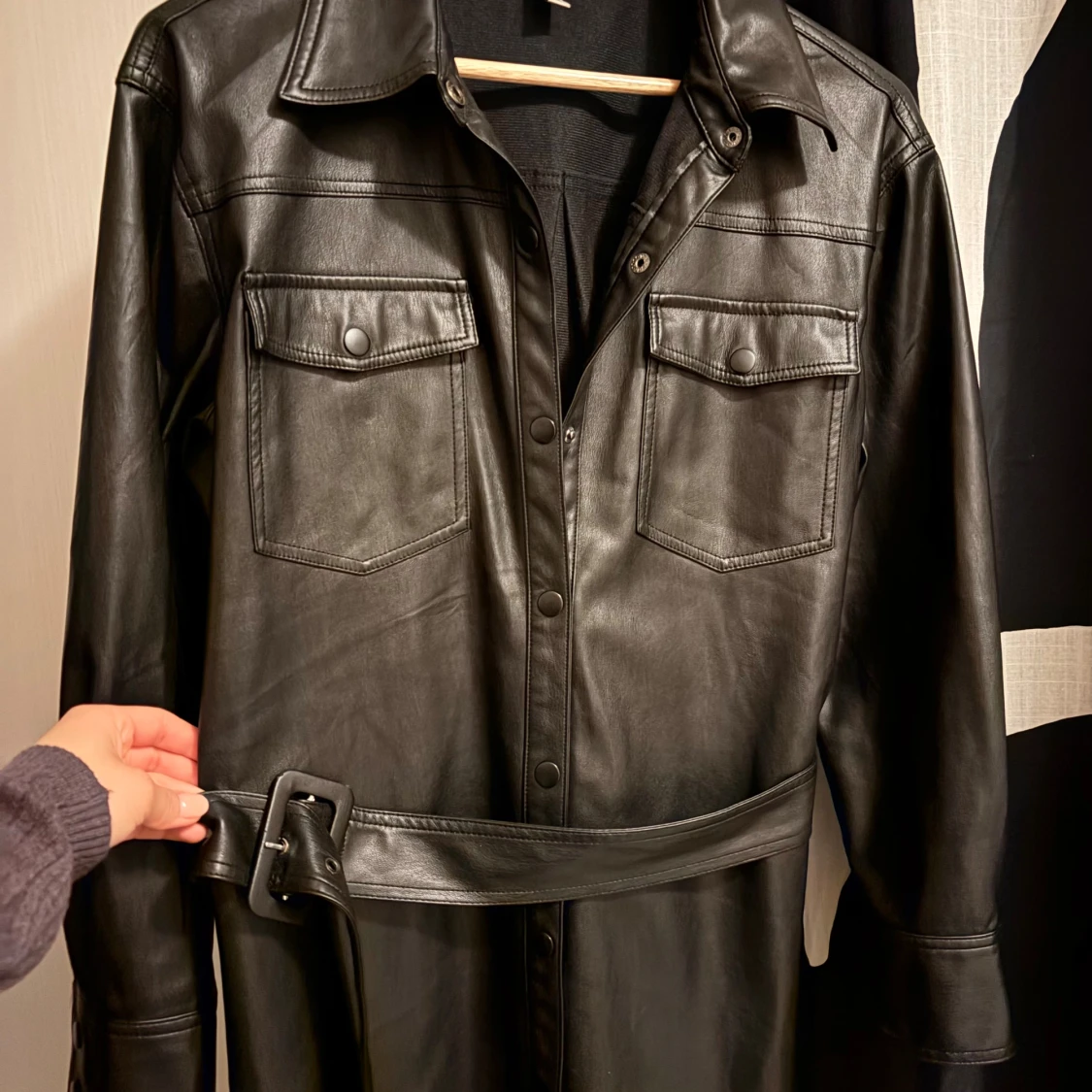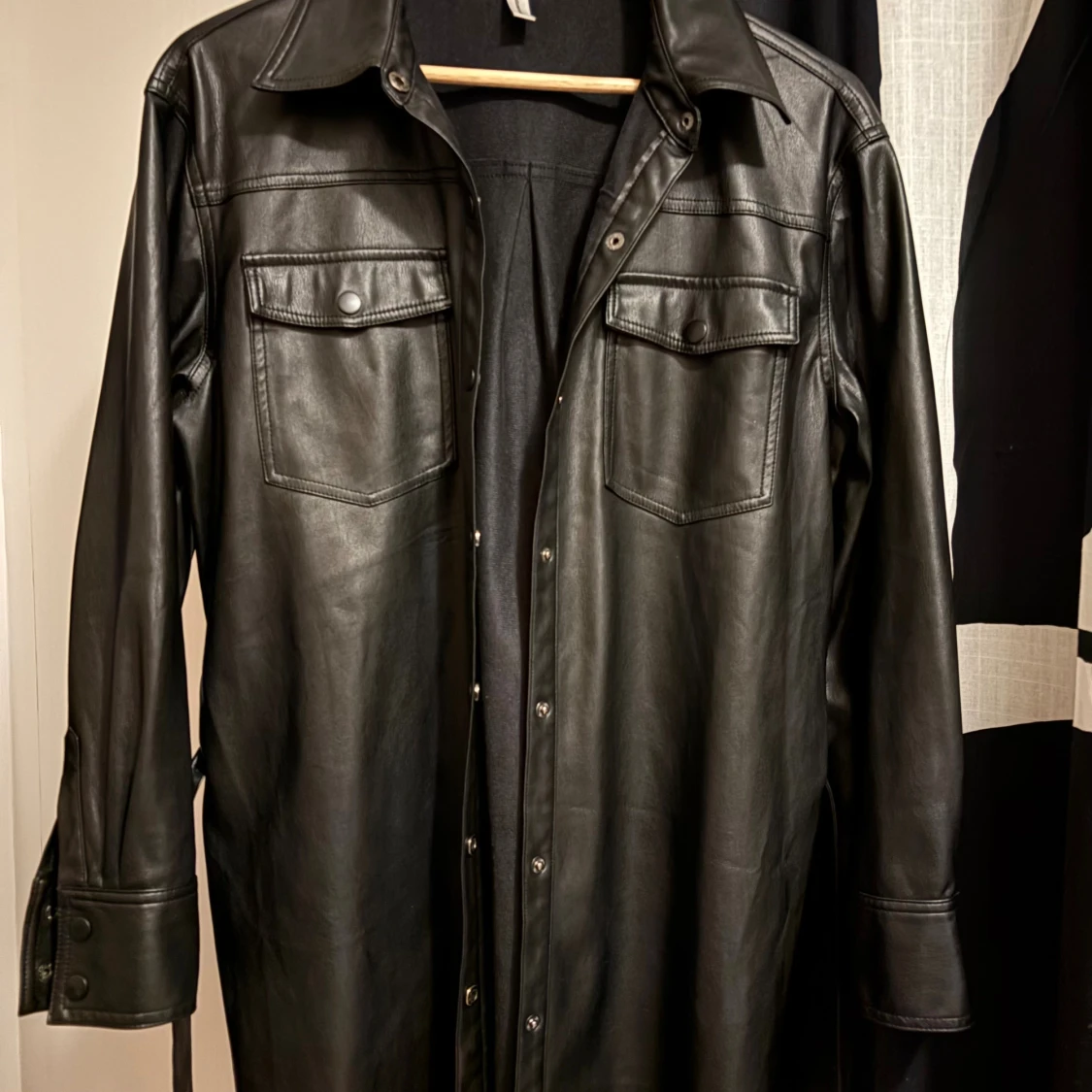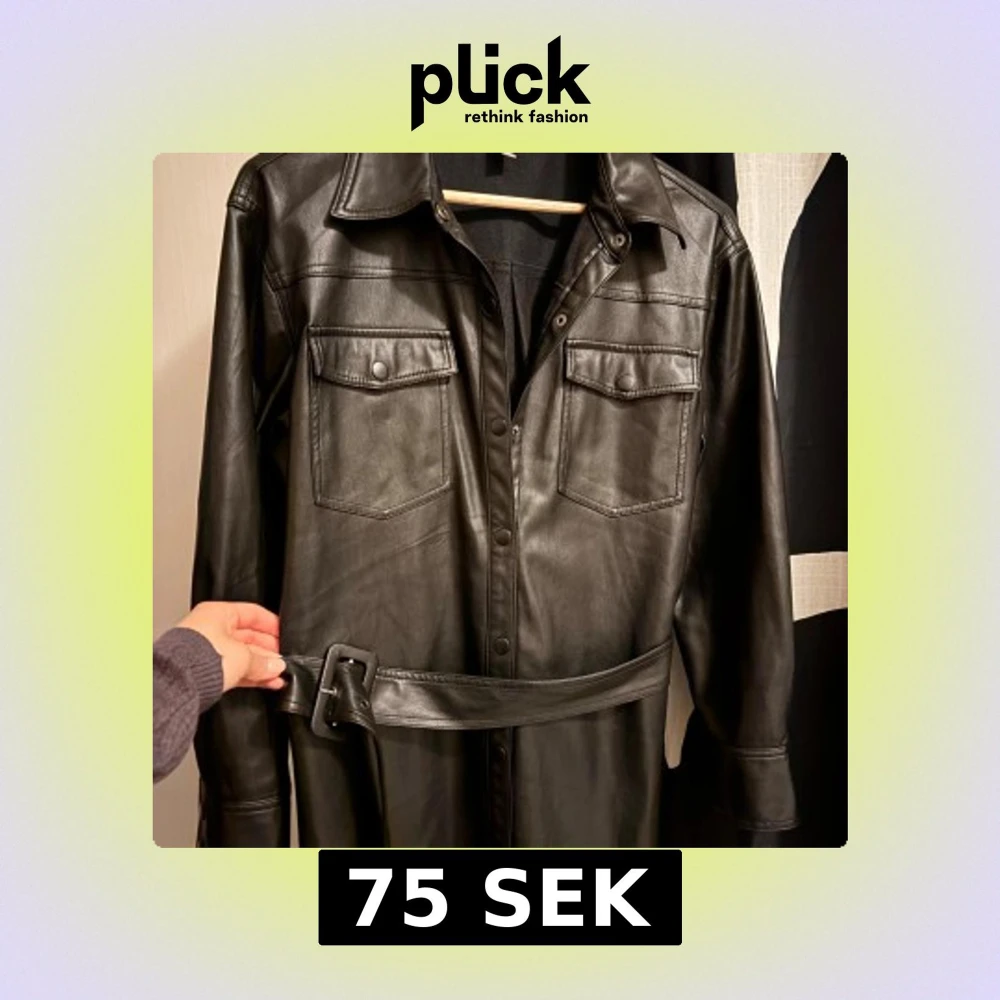 Svart skinnjacka från Soyaconcept med bälte i midjan, stora bröstfickor och tryckknappar framtill. Klänningen har lång ärm och klassisk krage, vilket ger en cool och edgy look. Perfekt för dig som vill sticka ut med en statement piece.