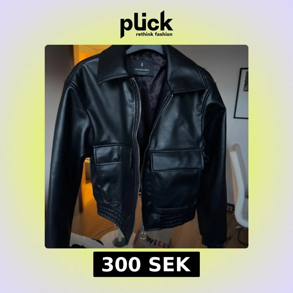 Snygg svart skinnjacka från Stradivarius i klassisk modell med stora fickor framtill och dragkedja. Jackan har bred krage, elastisk nederkant och raka ärmar. Perfekt för dig som vill ha en stilren och edgy look.