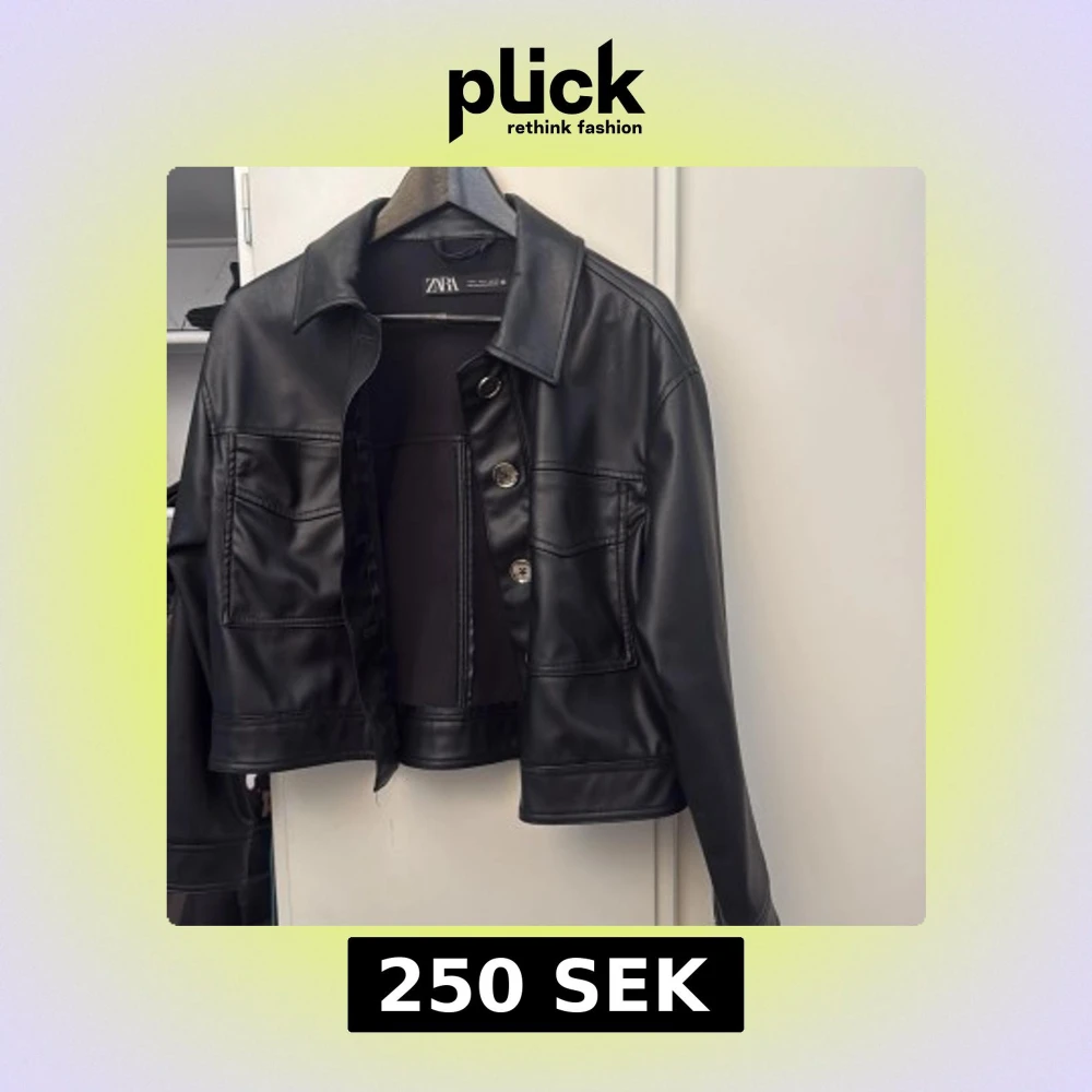 Snygg svart skinnjacka från Zara med klassisk krage och raka linjer. Jackan har två stora fickor framtill, knäppning med metallknappar och långärmade ärmar. Storlek S