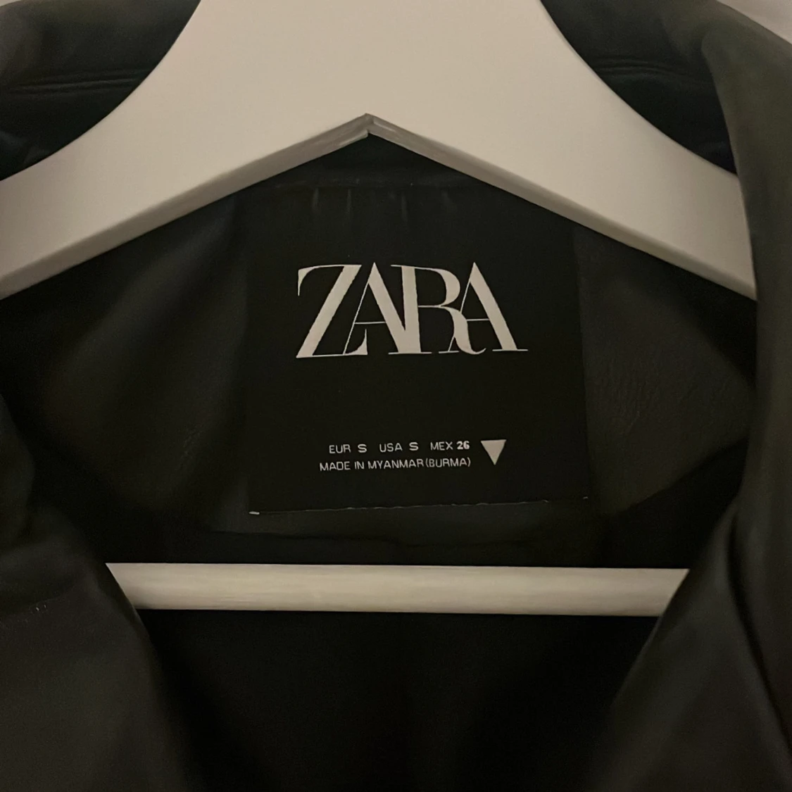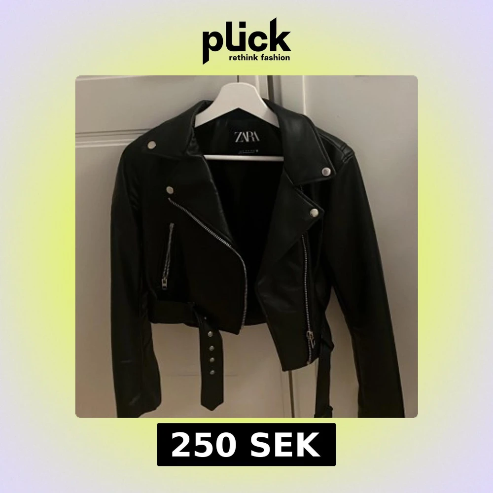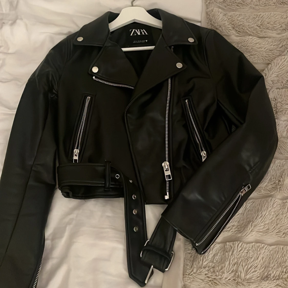 Snygg svart skinnjacka från Zara med dragkedjor och bälte. Jackan har en klassisk bikerstil med silverfärgade detaljer och är perfekt för en cool look💕
