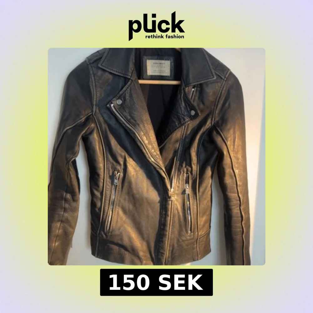 Snygg svart skinnjacka från Zara Basic i bikerstil med silvriga dragkedjor och klassisk krage. Jackan har figurnära passform, långa ärmar och två fickor med dragkedja framtill. Perfekt för dig som vill ha en edgy och tidlös look.