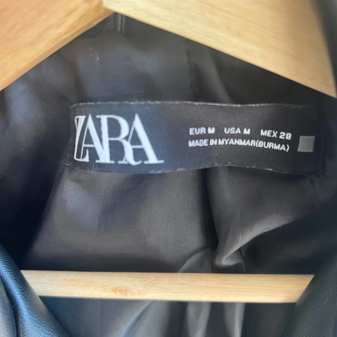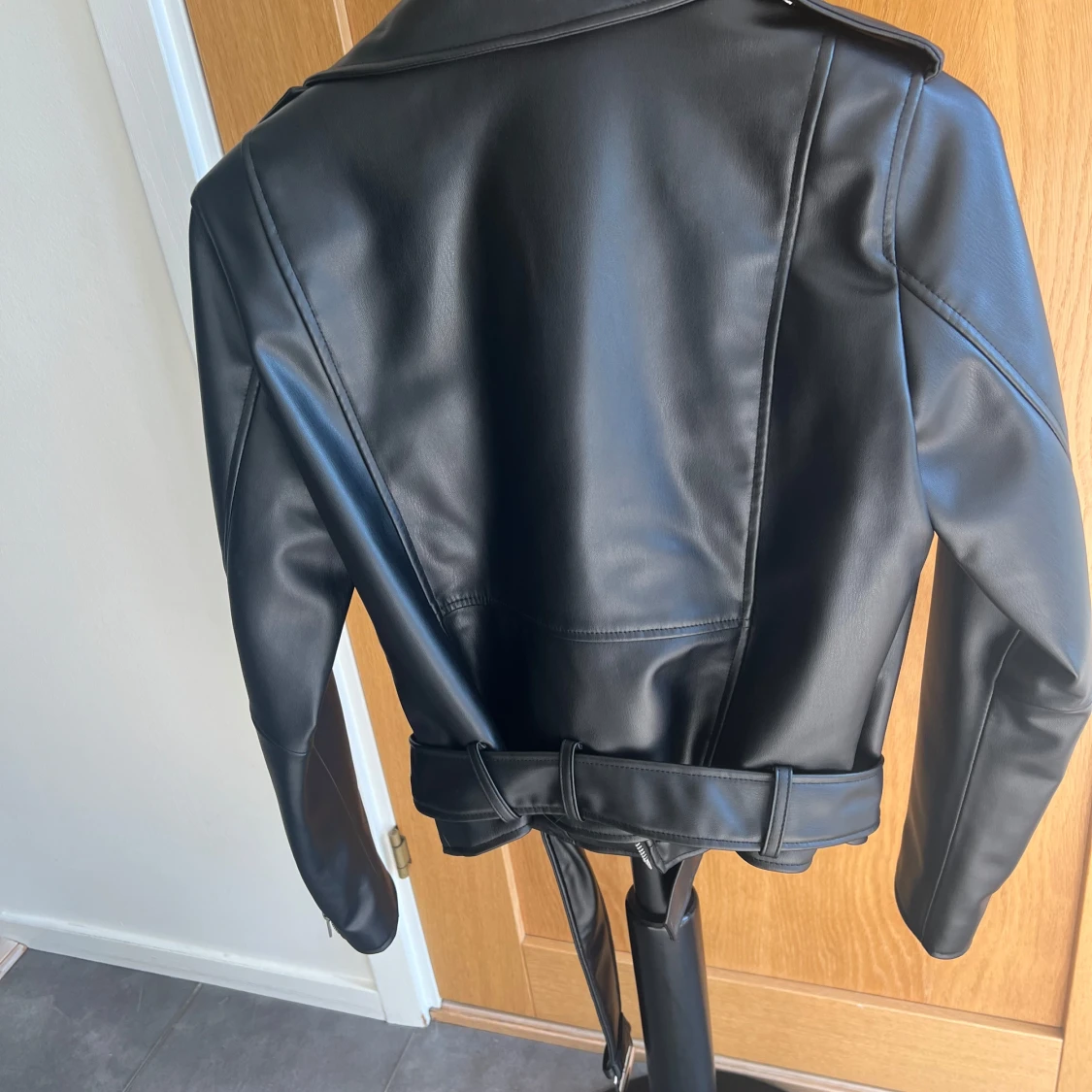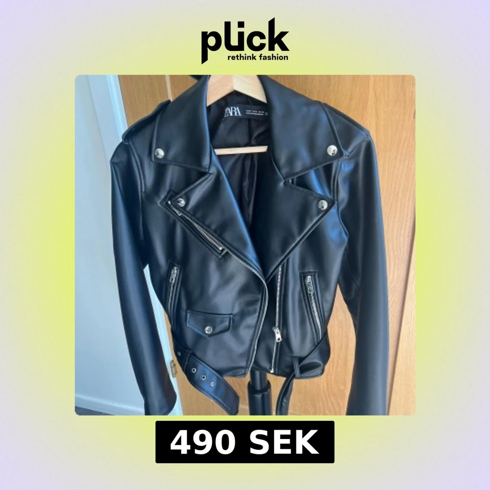 Snygg svart skinnjacka från Zara i klassisk bikerstil med silvriga dragkedjor, knappar och bälte i midjan. Jackan har långa ärmar, bred krage och flera fickor med dragkedja. Perfekt för dig som vill ha en edgy och stilren look.