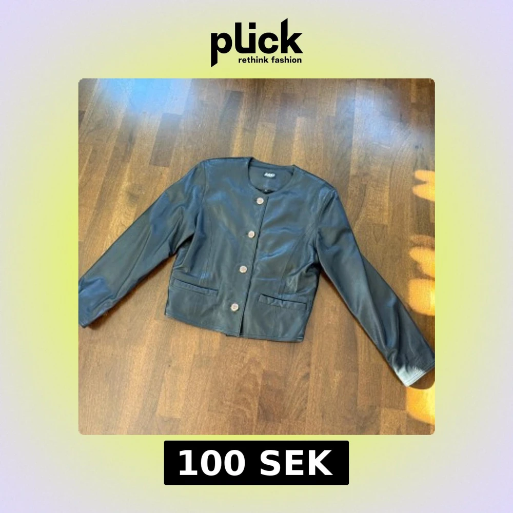 Snygg svart skinnjacka från Saki leather med rund hals och dekorativa knappar. Jackan har en stilren design med två fickor framtill och långa ärmar. Perfekt för en chic look! Superbra skick! Storlek M