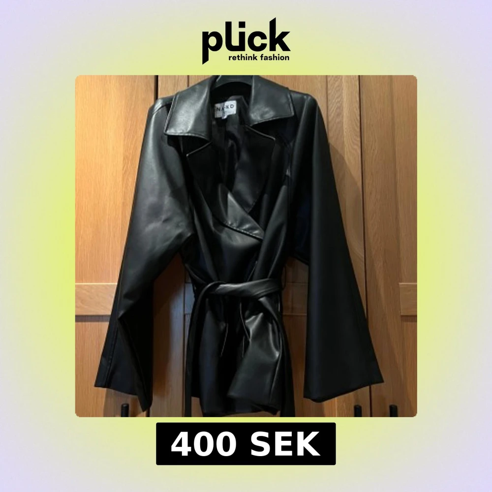 Säljer en svart skinnjacka från NA-KD med bälte i midjan. Jackan har klassisk krage och långa ärmar, perfekt för en cool och stilren look. Materialet är syntetiskt skinn och modellen är rak med markerad midja.