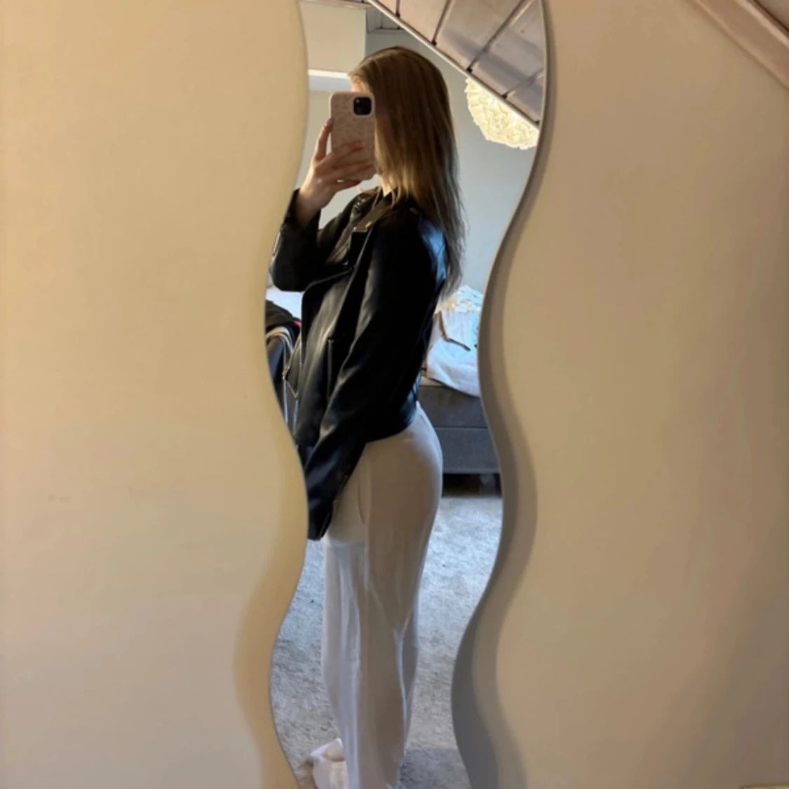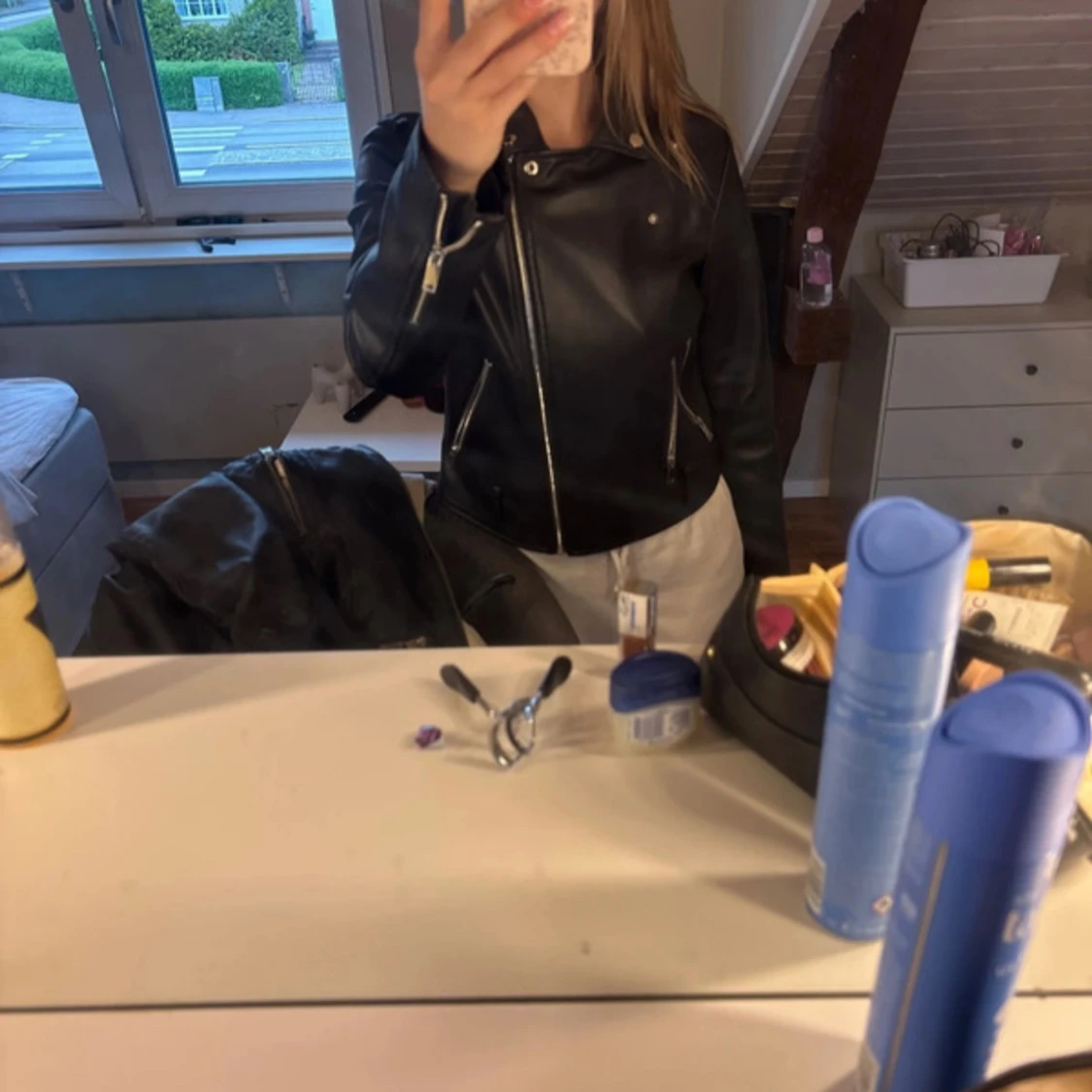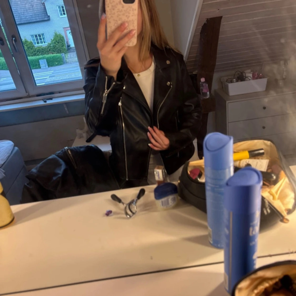 Säljer en svart skinnjacka med coola silvriga dragkedjor och klassisk bikerstil. Jackan har flera fickor med dragkedja och snygga detaljer vid axlar och ärmslut. Perfekt för dig som vill ha en edgy look till vardags. Passformen är normal och jackan är långärmad.