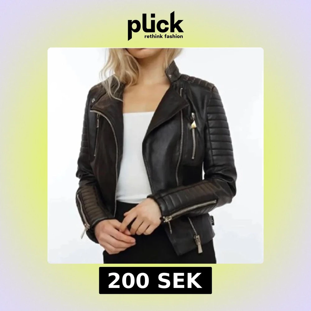 Säljer en svart skinnjacka med coola detaljer som dragkedjor på ärmar och bröst, samt quiltade partier på axlar och armar. Jackan har en klassisk bikerstil och snedställd dragkedja framtill. Perfekt för en edgy look.
